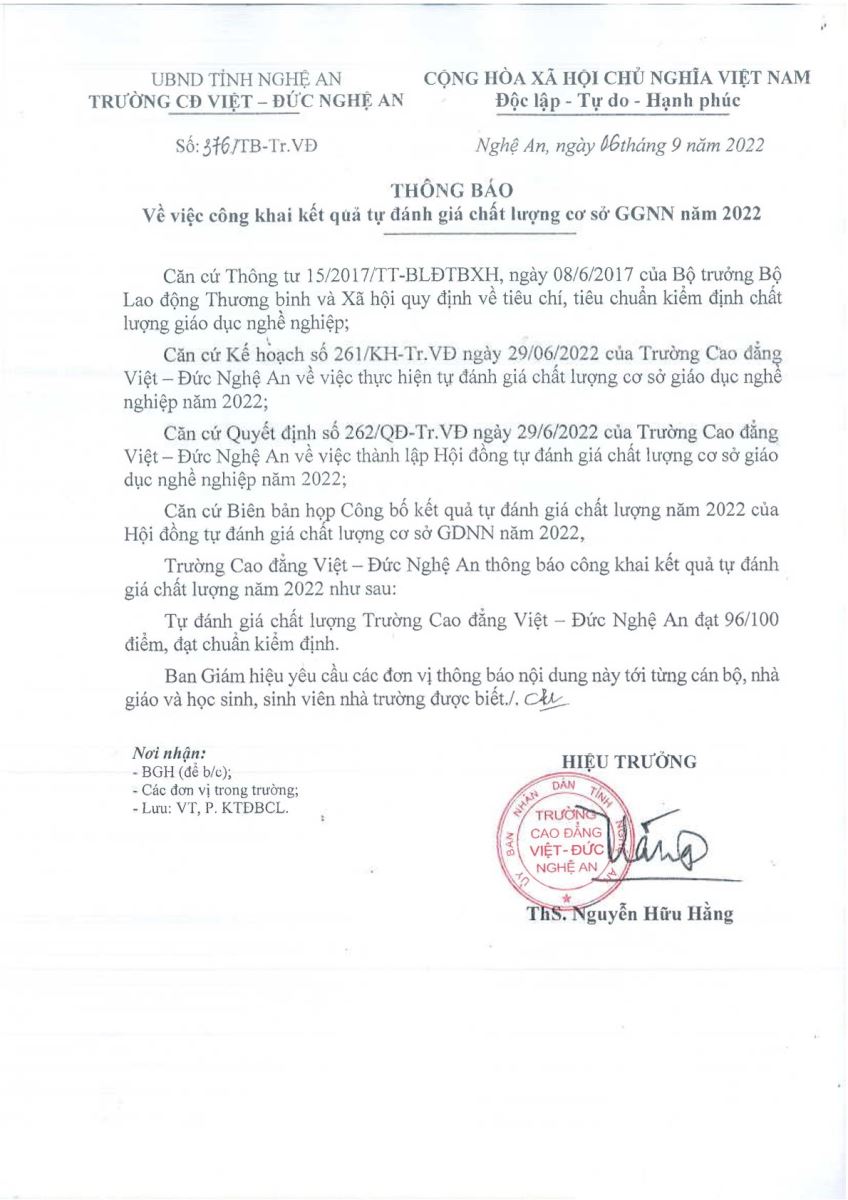 Thông báo số 376/TB-Tr.VĐ ngày 06/9/2022 của Trường Cao đẳng Việt - Đức Nghệ An về việc Công khai kết quả tự đánh giá chất lượng cơ sở GDNN năm 2022: