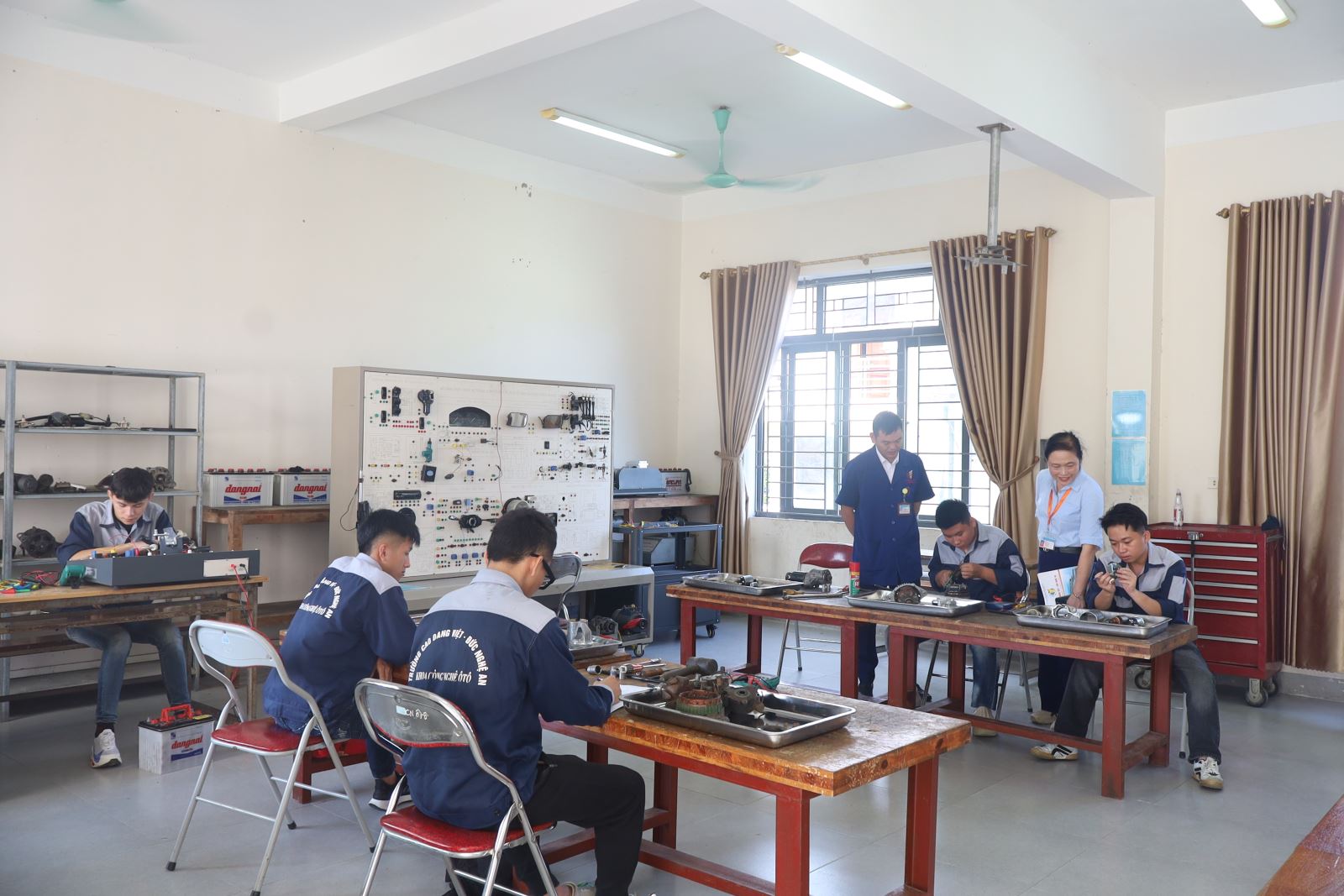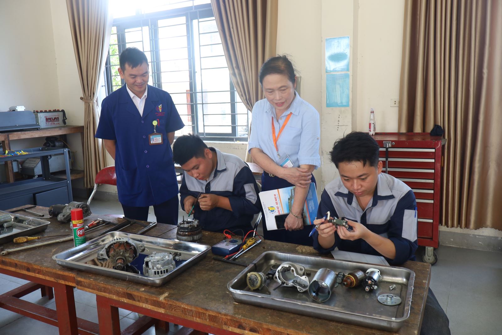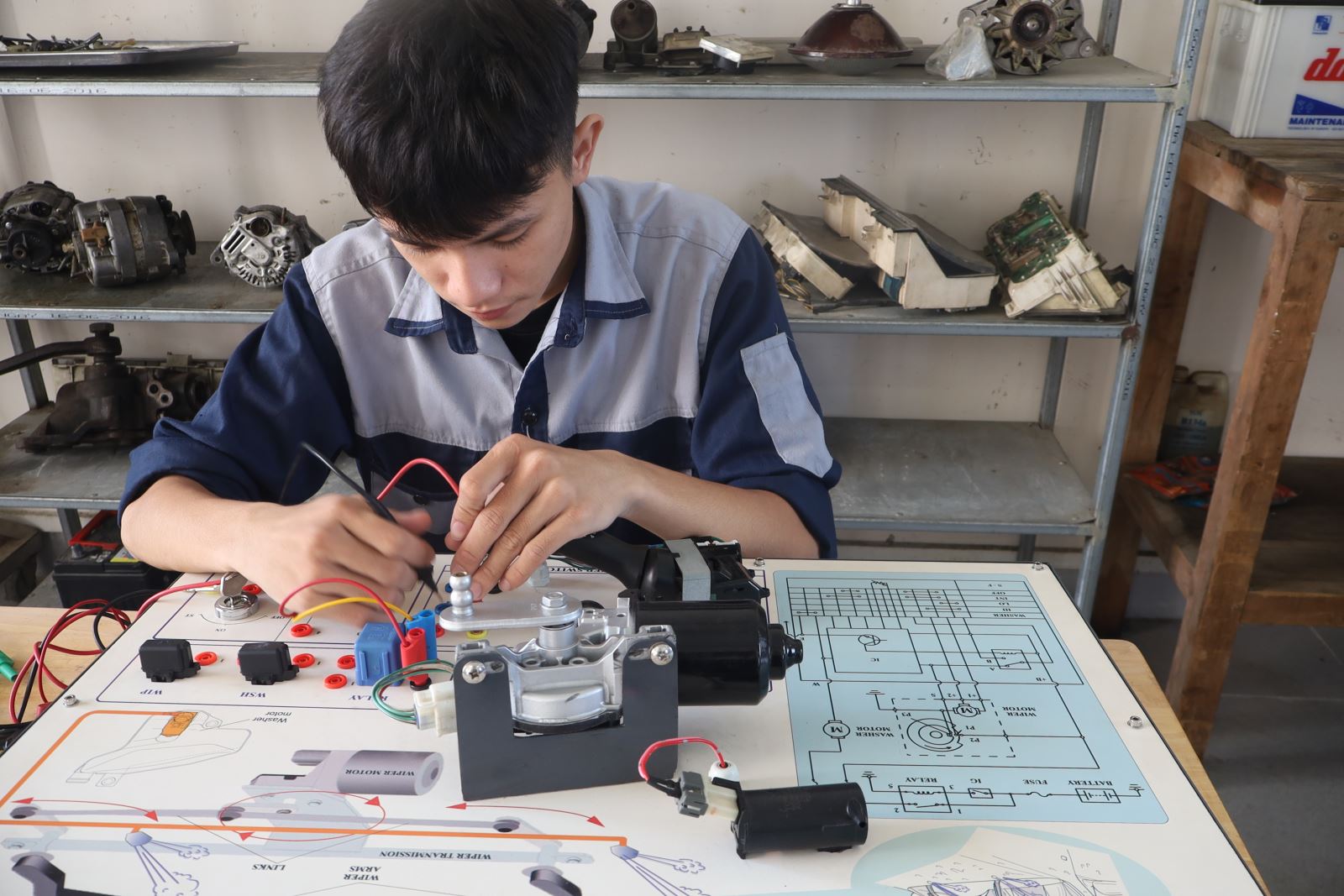 Các thí sinh dự thi thực hành nghề Công nghệ ô tô. Ảnh: Trịnh Hường