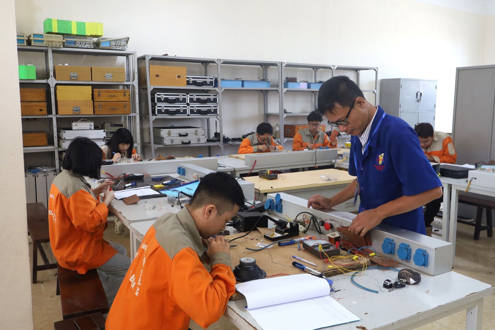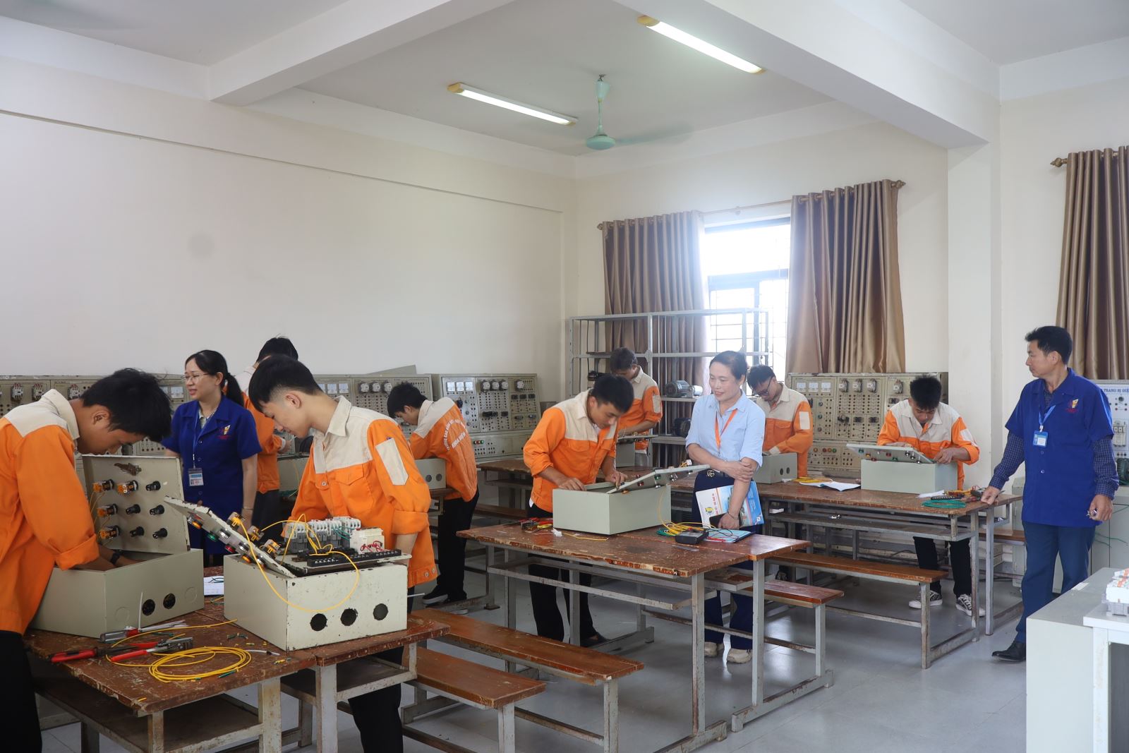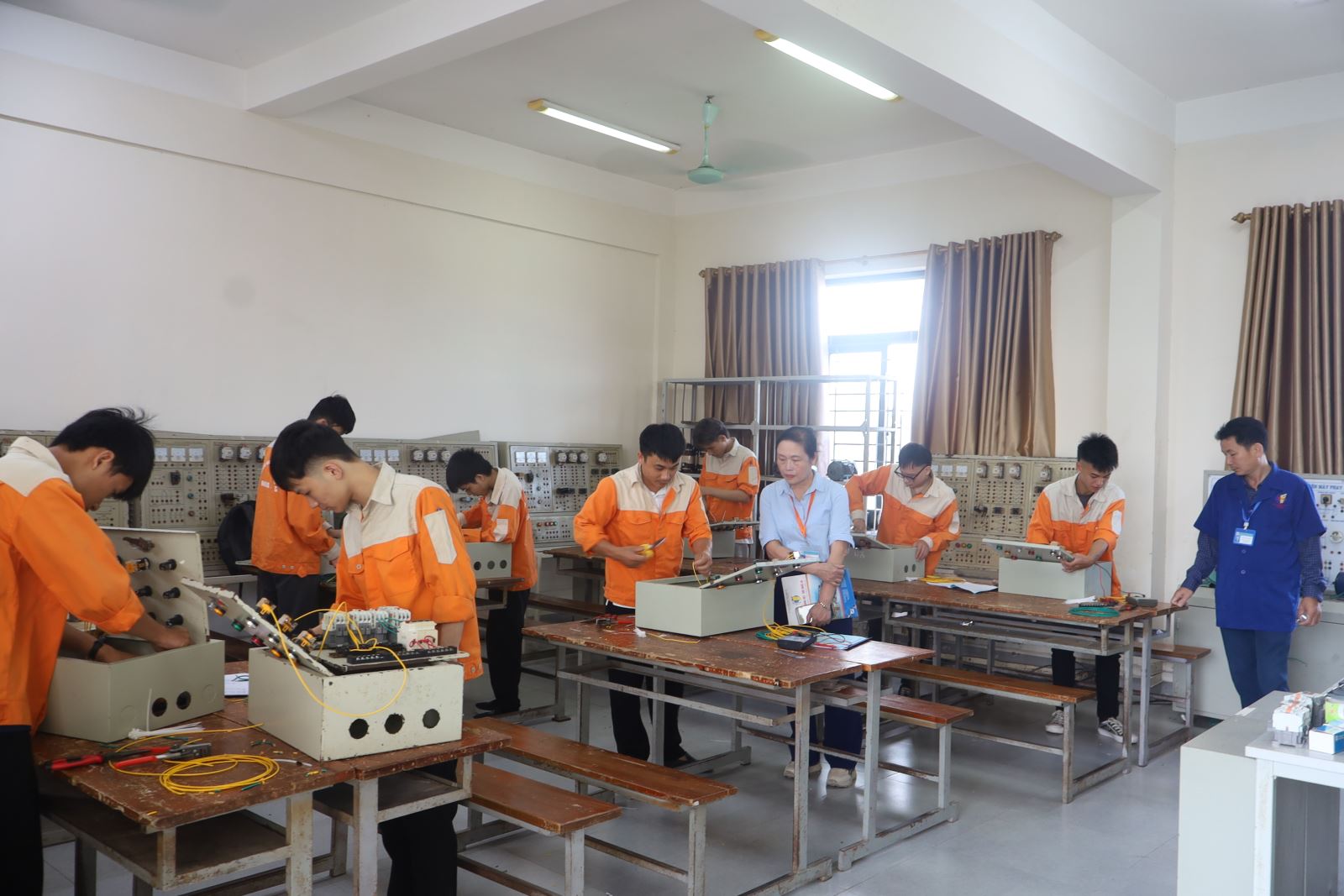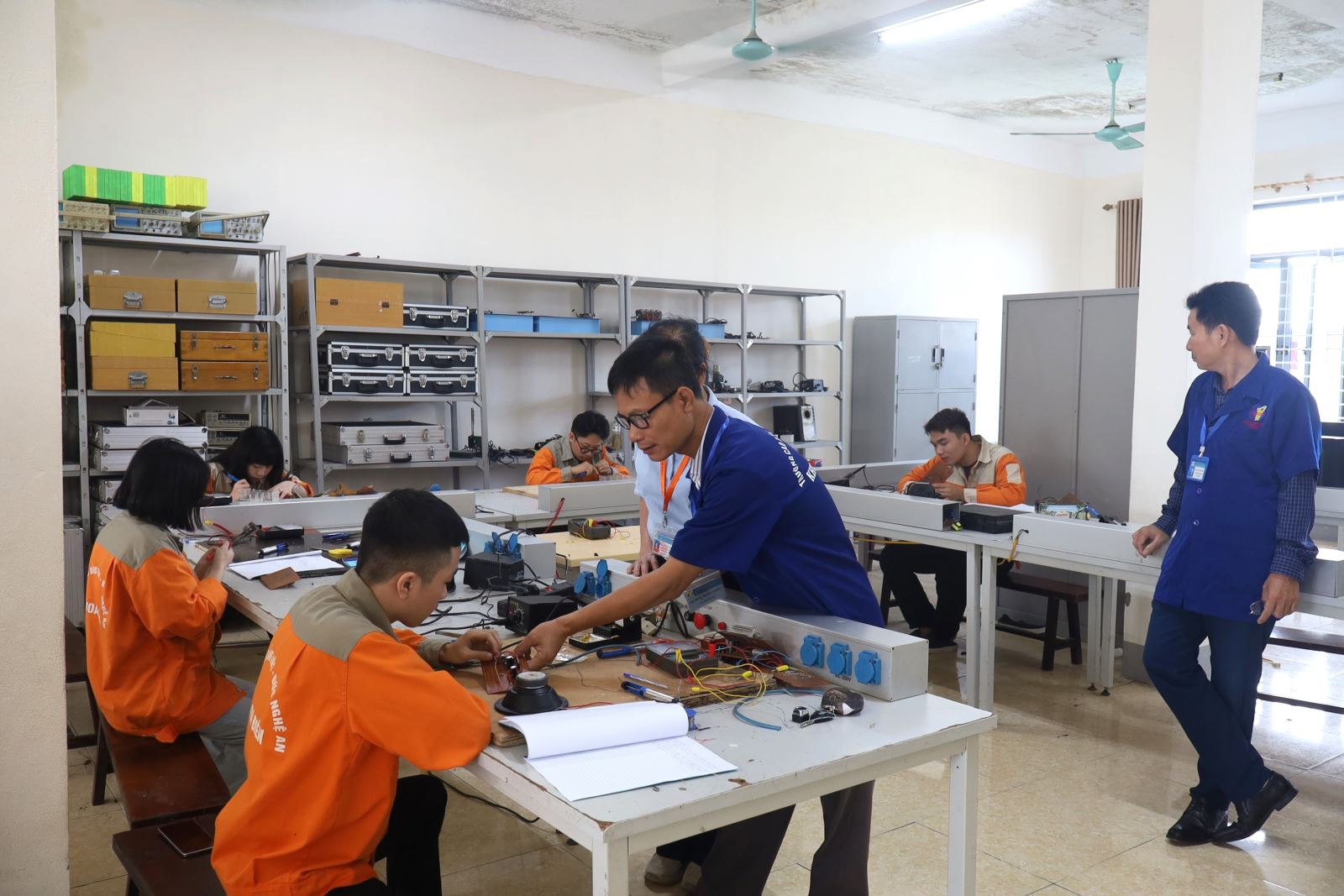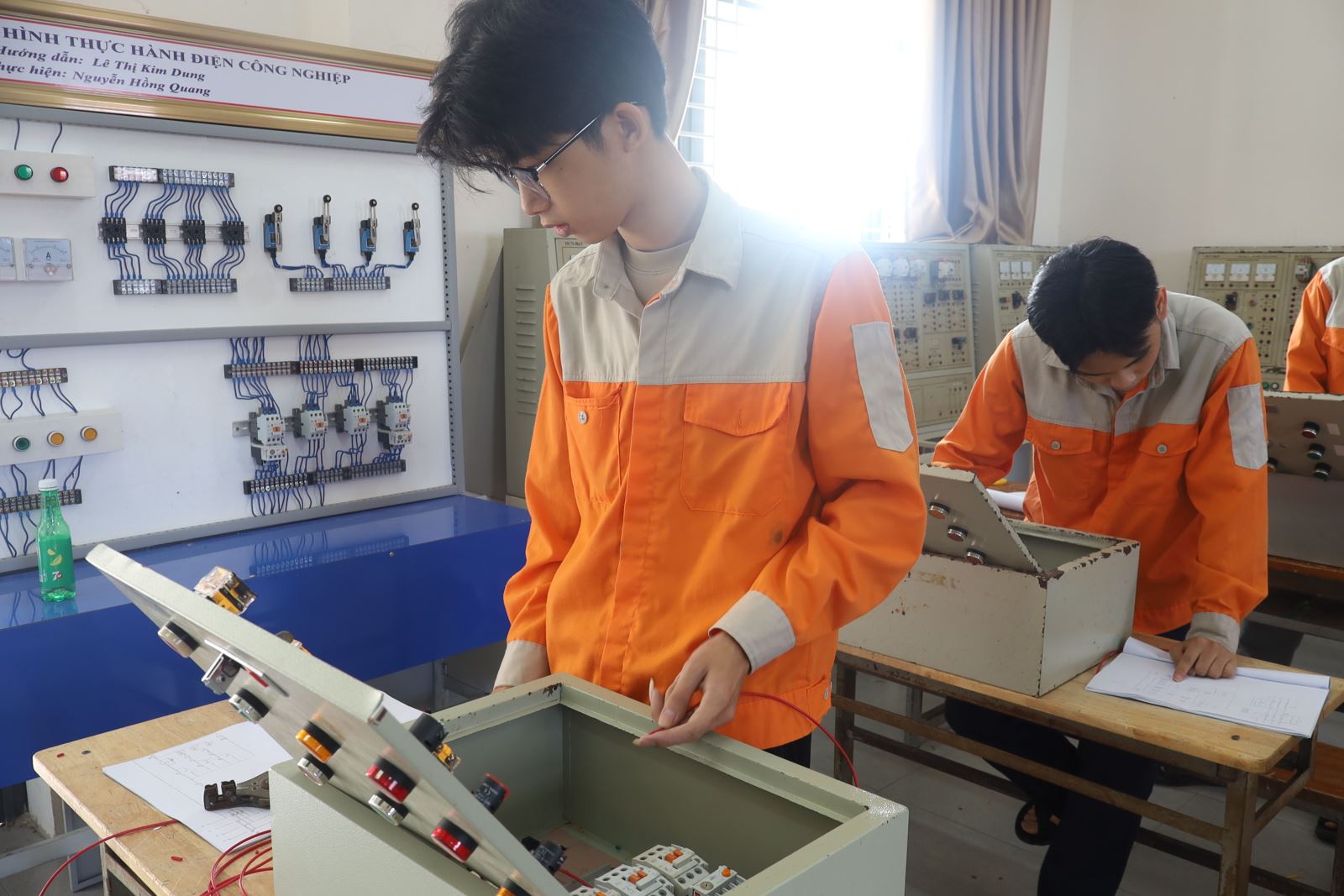 Các thí sinh dự thi thực hành nghề Điện công nghiệp. Ảnh: Trịnh Hường