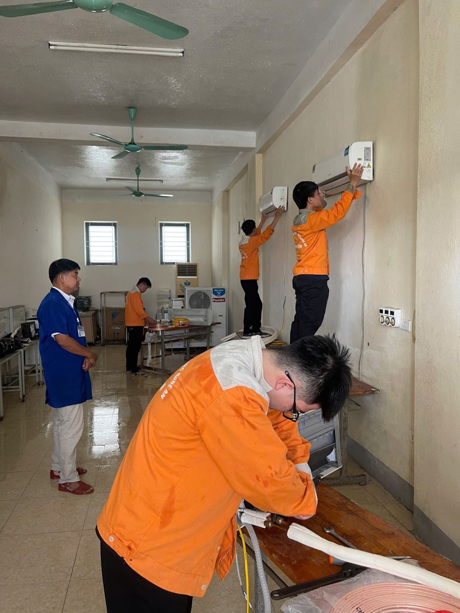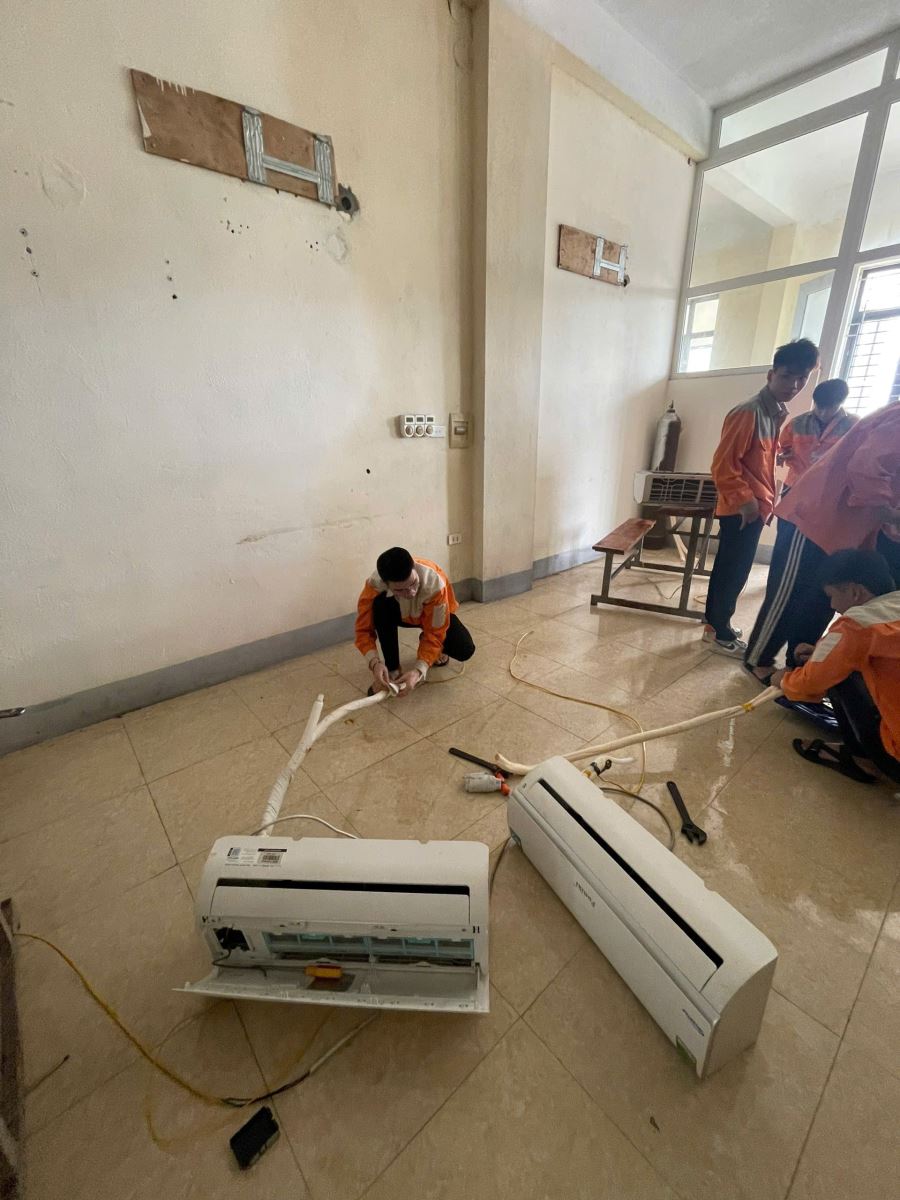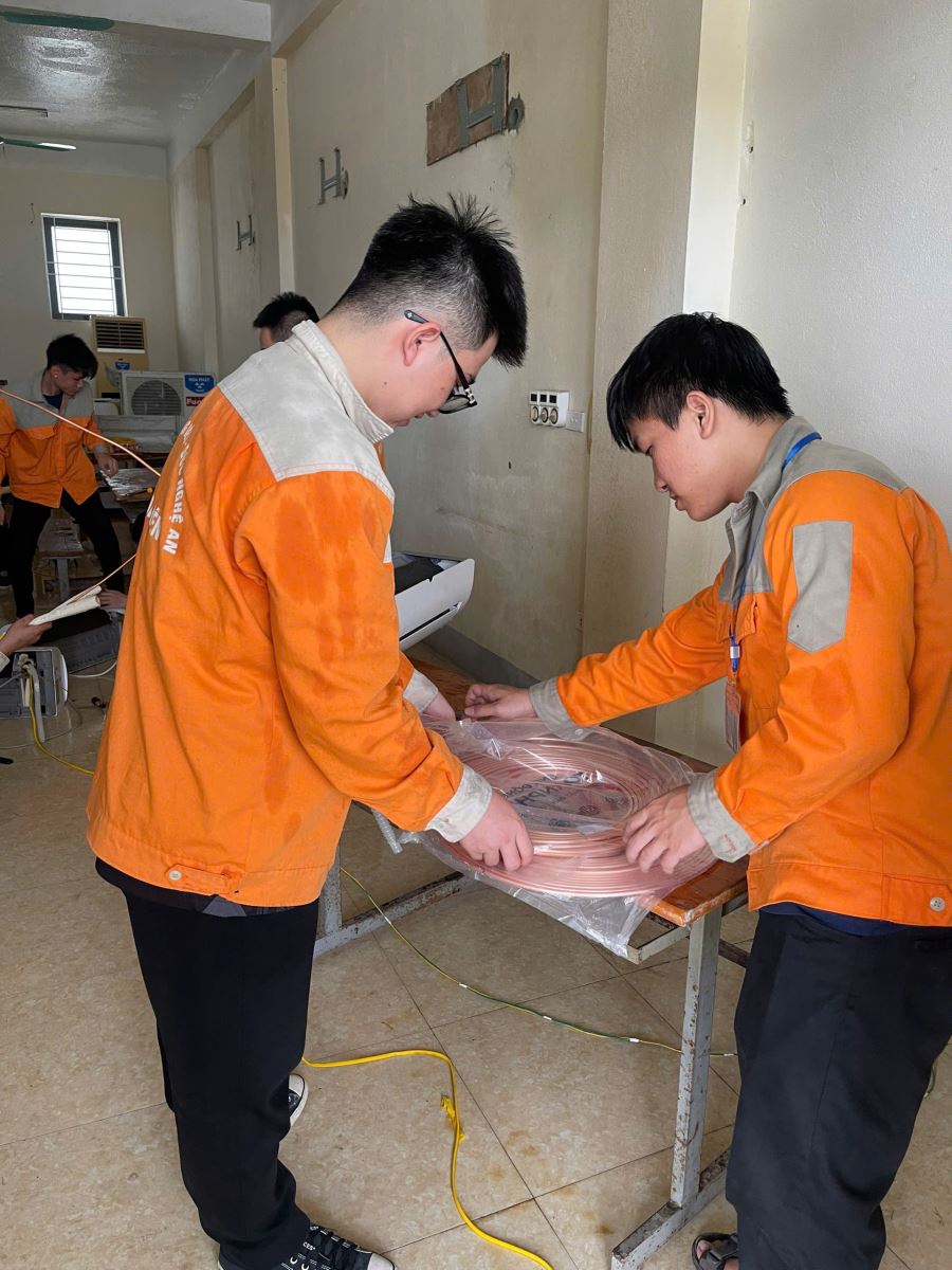 Các thí sinh dự thi thực hành nghề Kỹ thuật máy lạnh điều hòa không khí. Ảnh: Trịnh Hường
