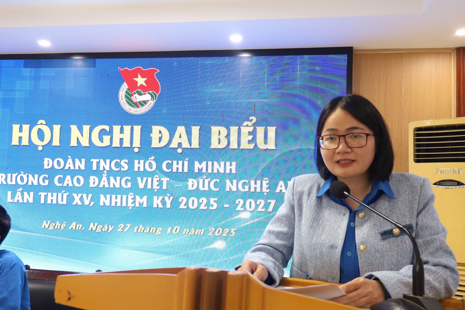 Phát biểu chỉ đạo tại Hội nghị, ThS. Cao Anh Tuấn – Phó Hiệu trưởng, Chủ tịch Công đoàn trường ghi nhận và biểu dương những thành tích mà Đoàn trường đã đạt được trong nhiệm kỳ qua, đồng chí Phó Hiệu trưởng nhấn mạnh: Tuổi trẻ Trường Cao đẳng Việt – Đức Nghệ An đã khẳng định được vai trò xung kích, sáng tạo trong học tập, rèn luyện và cống hiến. Đảng ủy, Ban Giám hiệu mong rằng trong nhiệm kỳ mới, tổ chức Đoàn tiếp tục phát huy tinh thần đoàn kết, tiên phong, góp phần xây dựng môi trường giáo dục nghề nghiệp năng động, sáng tạo và thân thiện, đồng hành cùng học sinh, sinh viên trên con đường lập thân, lập nghiệp.