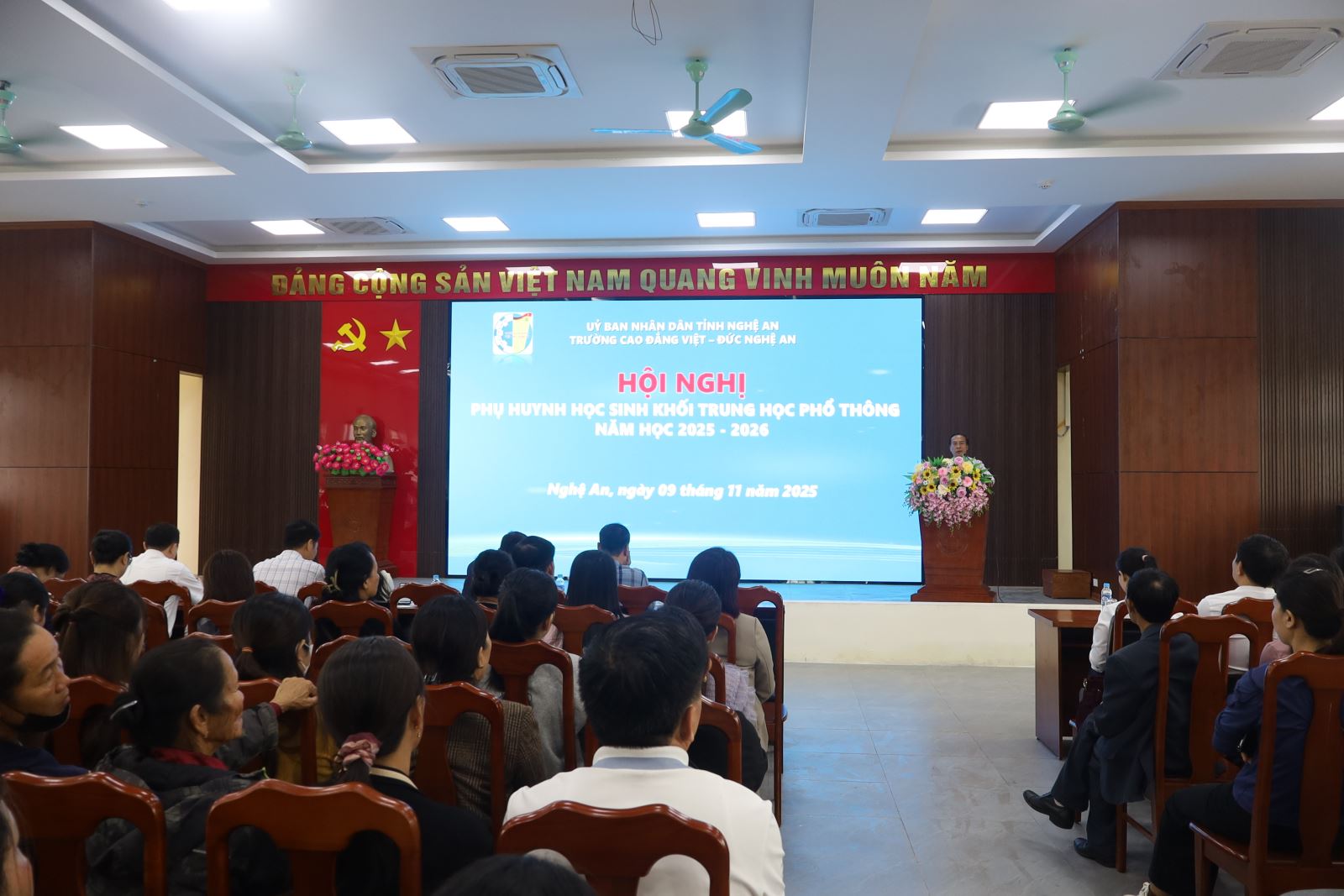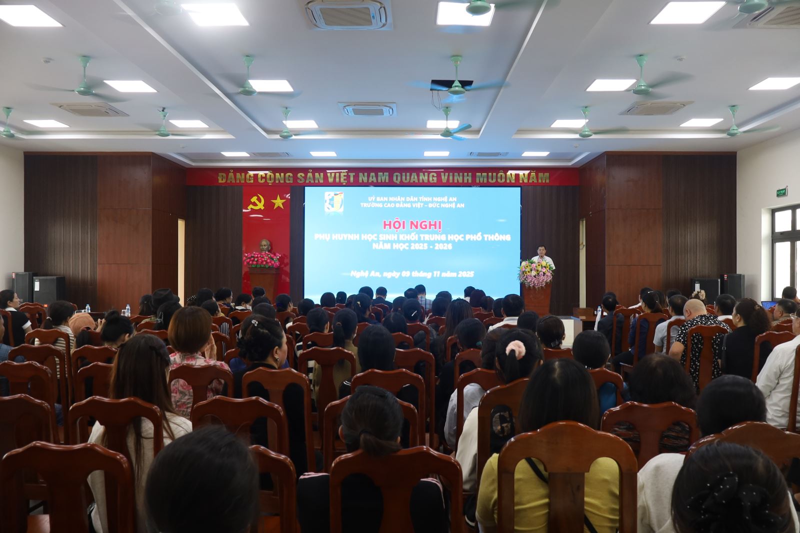 Thực hiện kế hoạch nhiệm vụ năm học 2025 – 2026, Sáng ngày 09/11/2025, Trường Cao đẳng Việt – Đức Nghệ An tổ chức Hội nghị phụ huynh học sinh khối THPT năm học 2025 – 2026, nhằm tăng cường sự phối hợp giữa nhà trường và gia đình trong công tác giáo dục đào tạo, đồng thời thông tin tới phụ huynh về định hướng đào tạo, rèn luyện và các hoạt động hỗ trợ học sinh, sinh viên trong năm học mới.