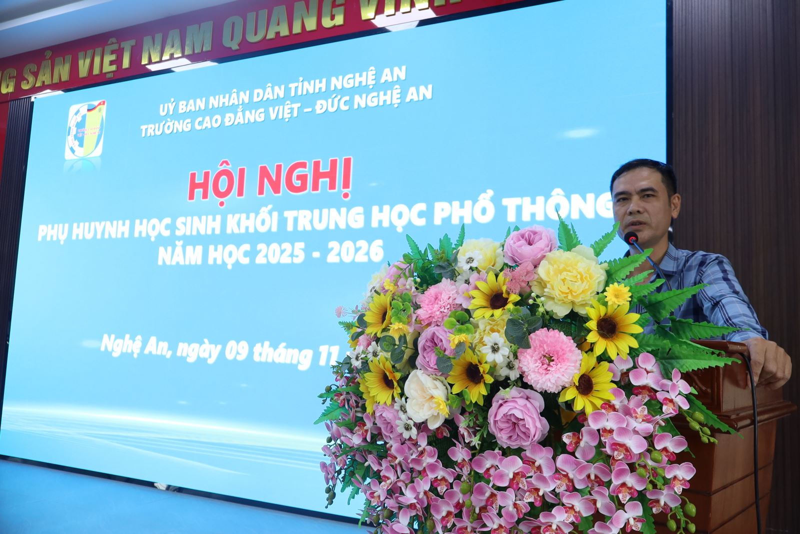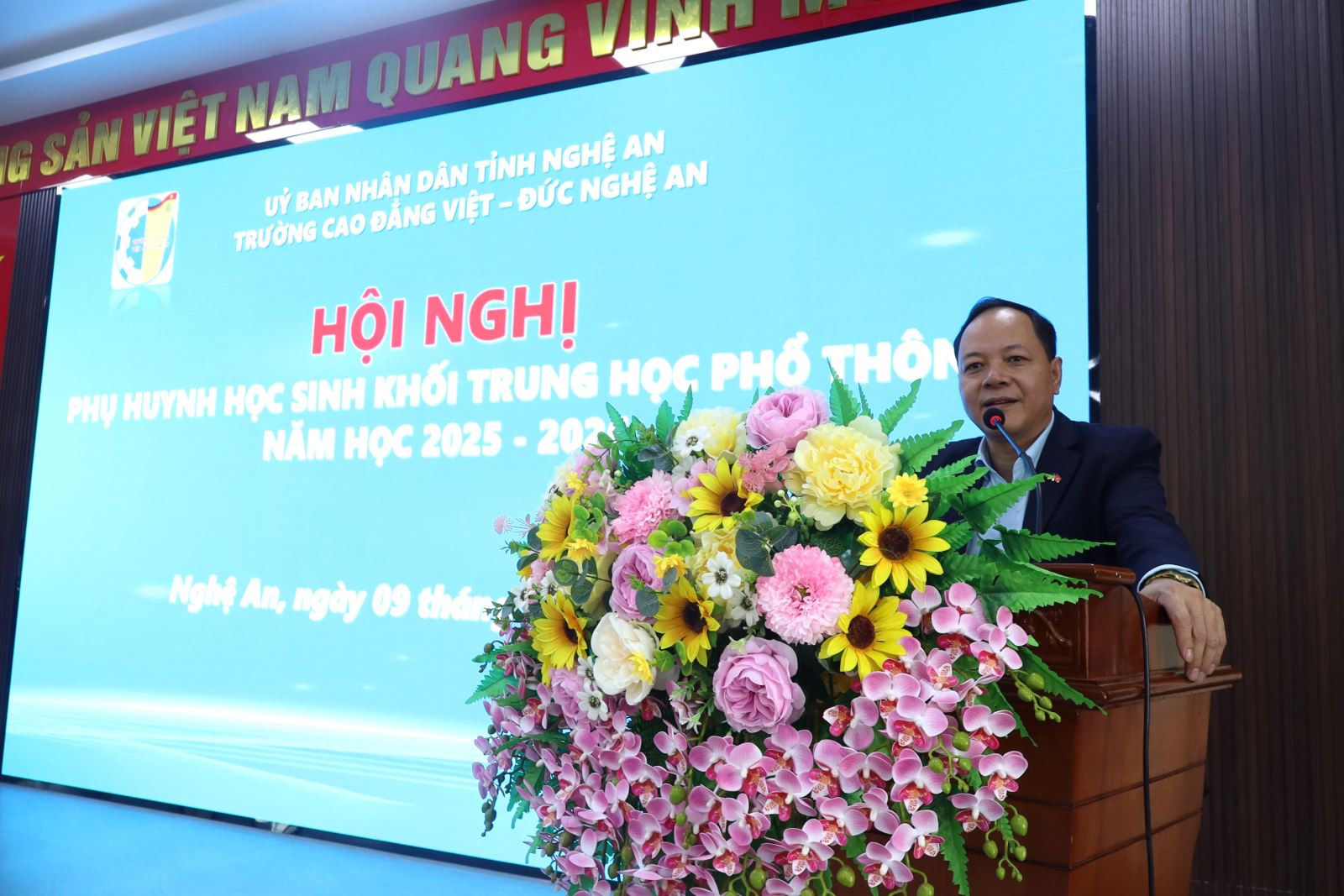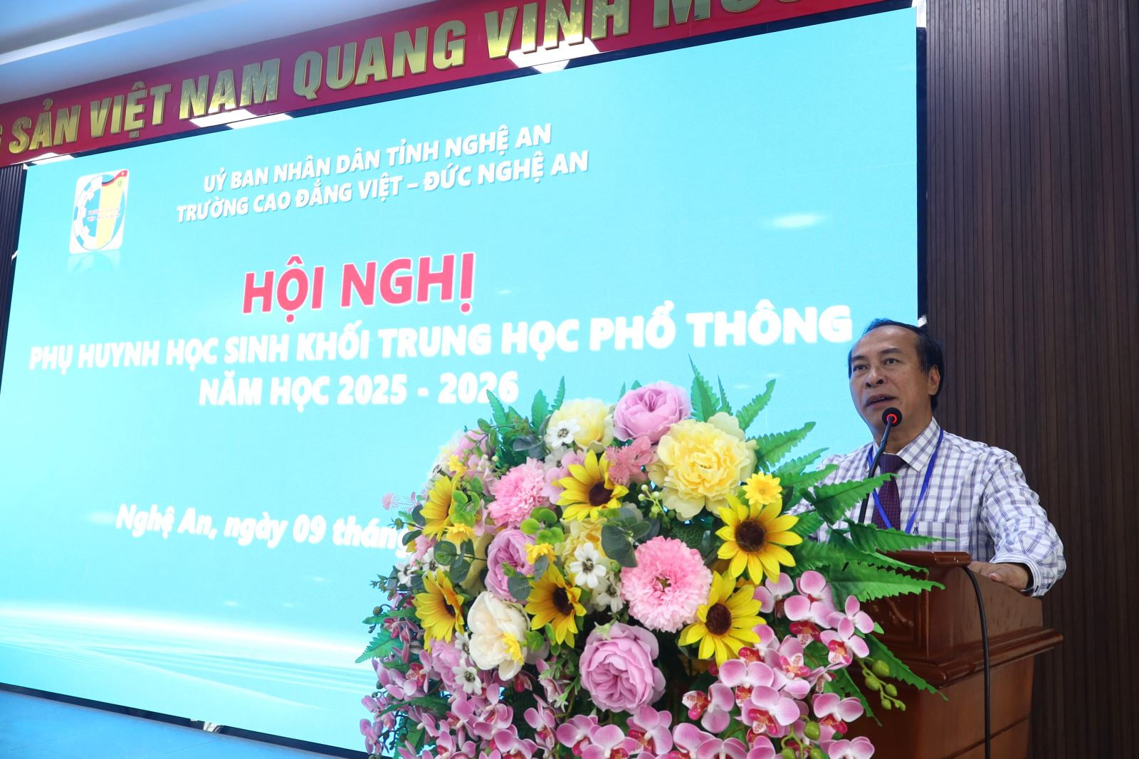 Phát biểu khai mạc, ThS. Nguyễn Hữu Hằng – Bí thư Đảng ủy, Hiệu trưởng nhấn mạnh vai trò quan trọng của gia đình trong việc đồng hành cùng Nhà trường xây dựng môi trường giáo dục đào tạo an toàn, thân thiện và hiệu quả. Năm học 2025 – 2026 được xác định là năm tiếp tục đổi mới phương pháp giảng dạy, tăng cường kỹ năng mềm, hướng nghiệp và trải nghiệm thực tế cho học sinh trên nền tảng chương trình Giáo dục Phổ thông kết hợp Giáo dục nghề nghiệp của Trường Cao đẳng Việt – Đức Nghệ An.