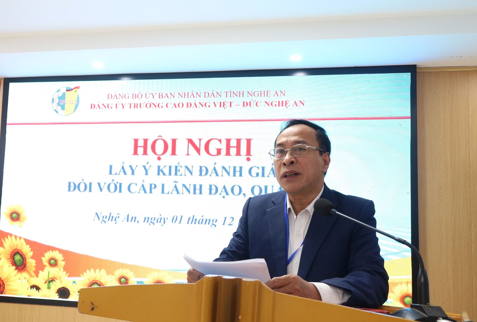 Phát biểu tại hội nghị, ThS. Nguyễn Hữu Hằng – Bí thư Đảng ủy, Hiệu trưởng nhấn mạnh: công tác đánh giá cán bộ giữ vai trò then chốt trong việc xây dựng đội ngũ lãnh đạo, quản lý có năng lực, uy tín, đáp ứng yêu cầu đổi mới Giáo dục nghề nghiệp và định hướng phát triển của Trường Cao đẳng Việt – Đức Nghệ An trong giai đoạn mới. Đồng chí đề nghị các đại biểu thực hiện đánh giá với tinh thần trách nhiệm cao, khách quan, thẳng thắn, góp phần hoàn thiện bộ máy và nâng cao hiệu quả hoạt động của Nhà trường.