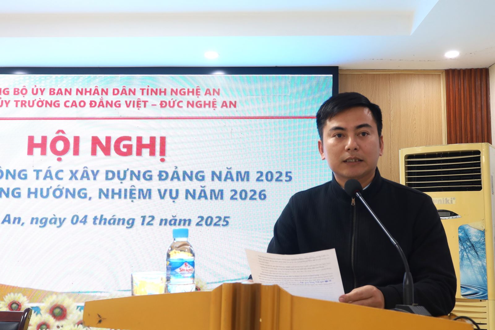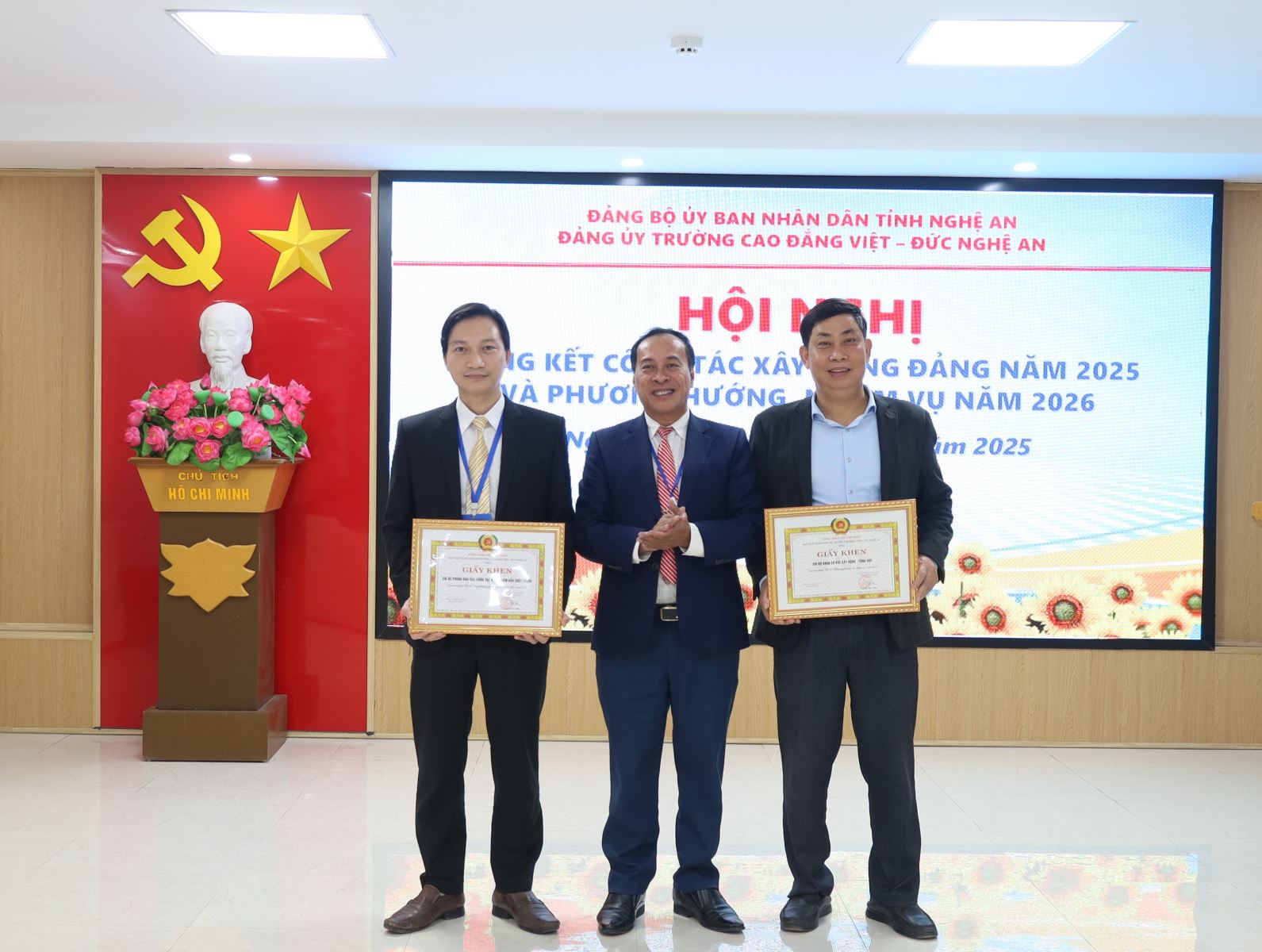 Tại Hội nghị, Đảng bộ Trường Cao đẳng Việt – Đức Nghệ An đã công bố Quyết định xếp loại đảng viên năm 2025. Chi bộ Đào tạo – Công tác HSSV – Đảm bảo chất lượng đạt danh hiệu Chi bộ hoàn thành xuất sắc nhiệm vụ tiêu biểu; Chi bộ khoa Cơ khí – Xây dựng – Tổng hợp đạt danh hiệu Chi bộ hoàn thành xuất sắc nhiệm vụ và 14 cá nhân đạt danh hiệu Đảng viên hoàn thành xuất sắc nhiệm vụ, trong đó có 07 cá nhân đạt danh hiệu Đảng viên hoàn thành xuất sắc nhiệm vụ tiêu biểu trong năm 2025.