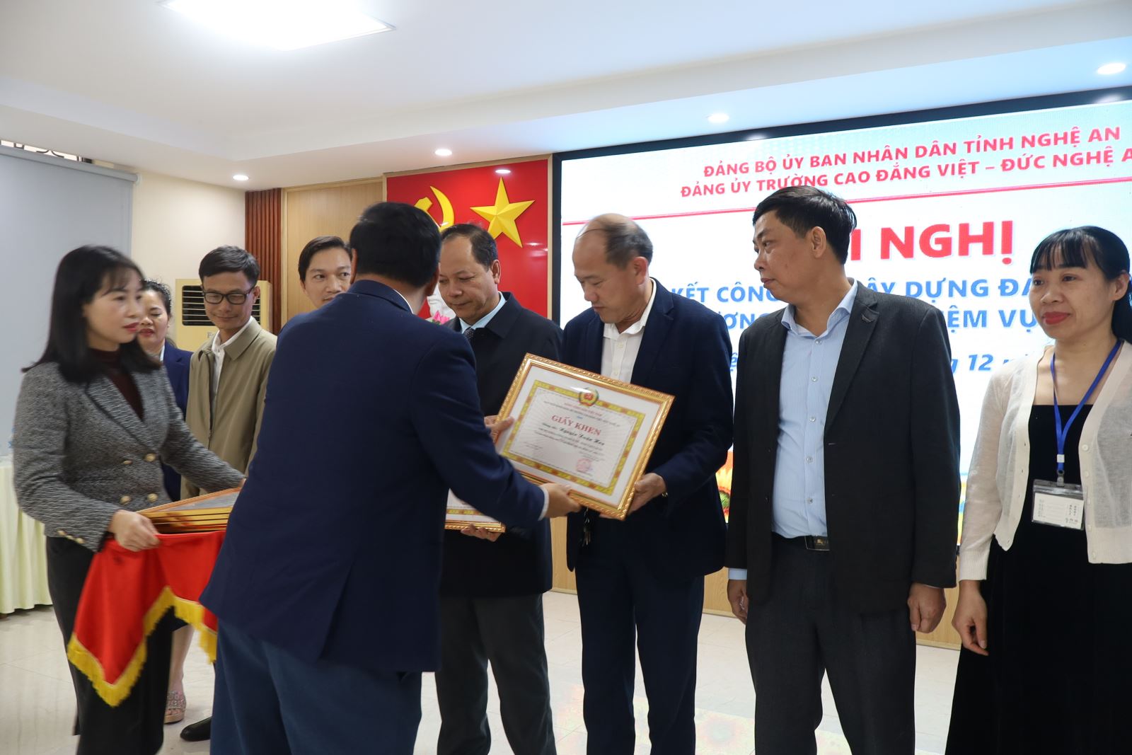 Với những kết quả đạt được trên các mặt hoạt động, Trường Cao đẳng Việt – Đức Nghệ An đã được xếp loại chất lượng và khen thưởng cho các tập thể và cá nhân công tác Đảng, công tác chuyên môn và các đoàn thể.