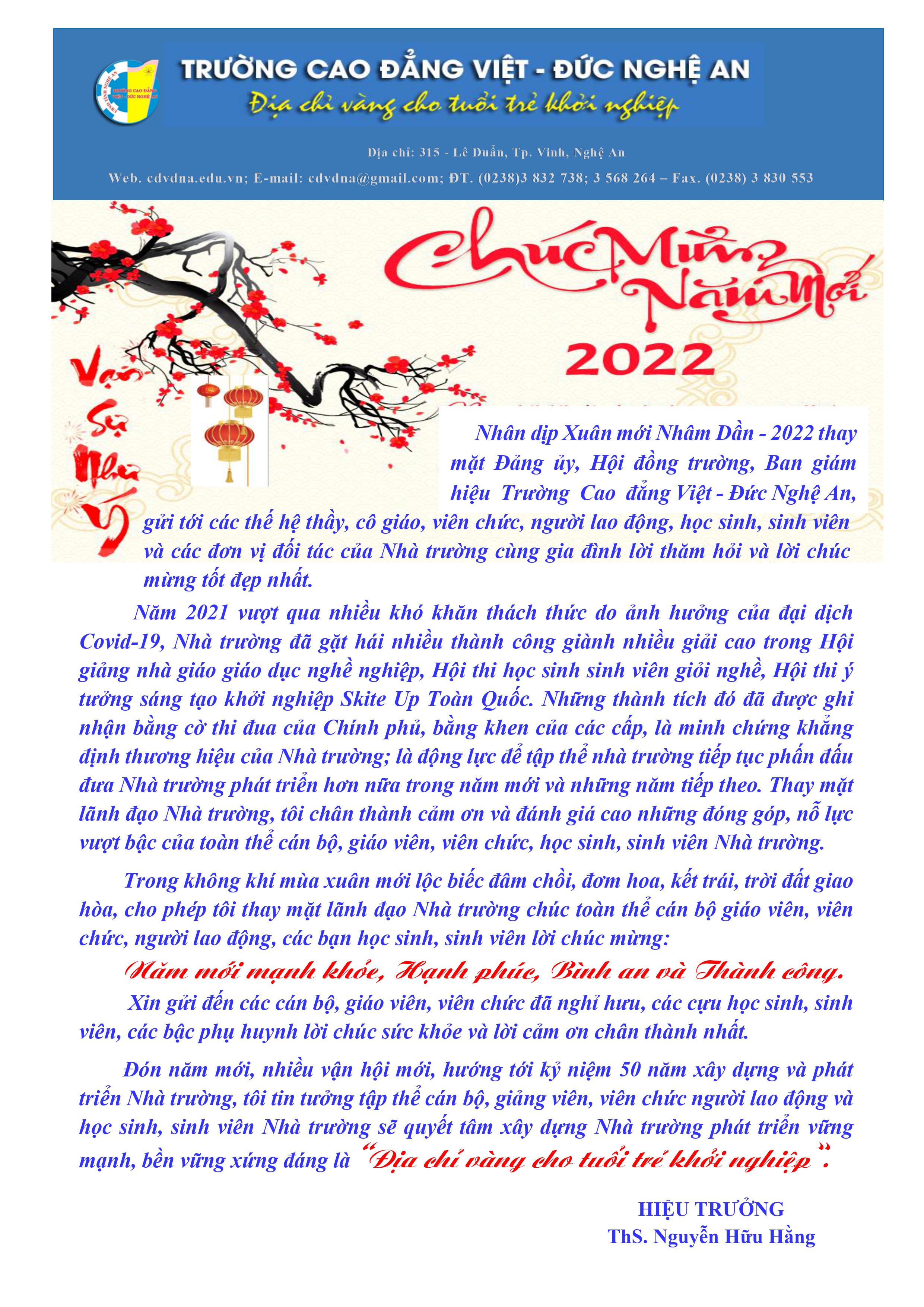 Thư chúc Tết của Hiệu trưởng Trường Cao đẳng Việt - Đức Nghệ An
