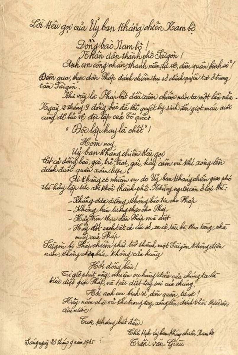 Lời kêu gọi của Ủy ban Kháng chiến Nam Bộ. Ảnh: Tư liệu