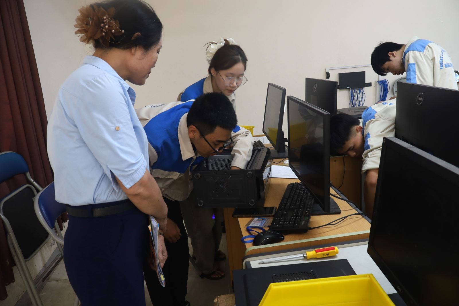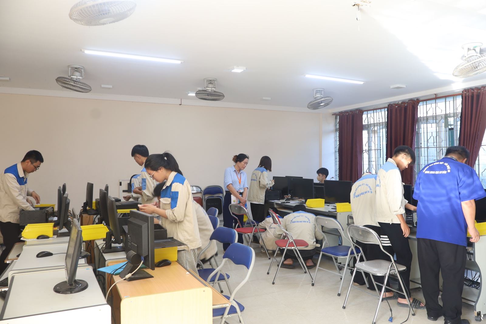 Các thí sinh dự thi thực hành nghề Sửa chữa lắp ráp máy tính. Ảnh: Trịnh Hường