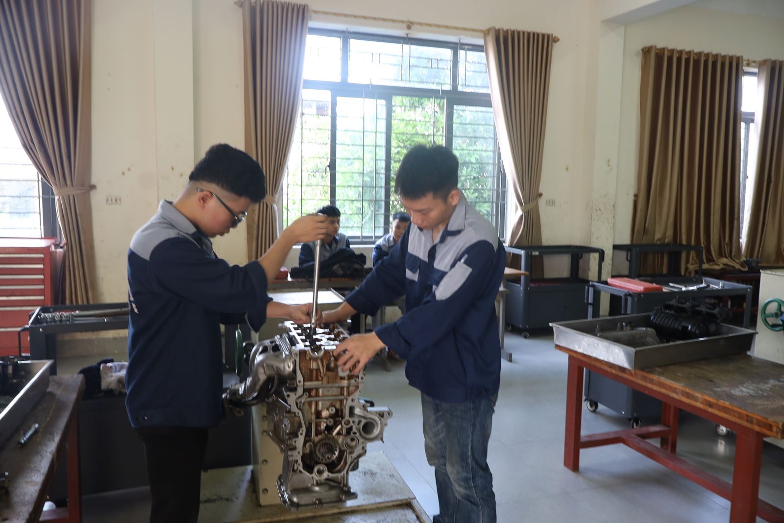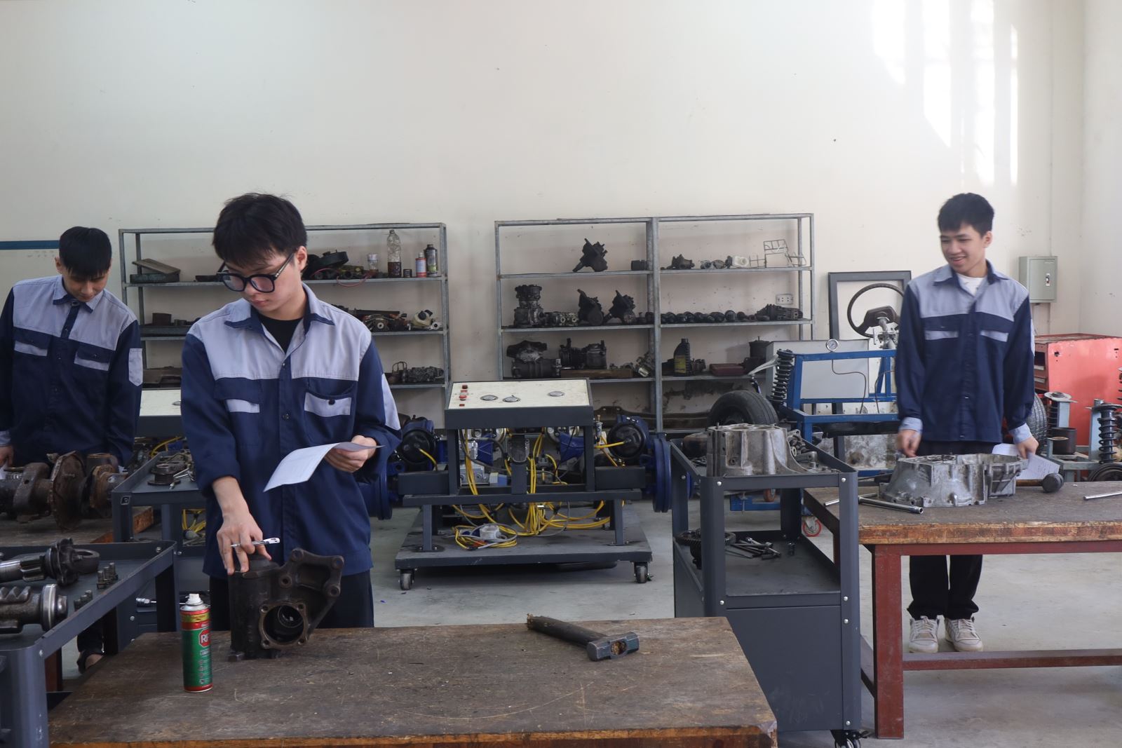 Các thí sinh dự thi thực hành nghề Công nghệ ô tô. Ảnh: Trịnh Hường