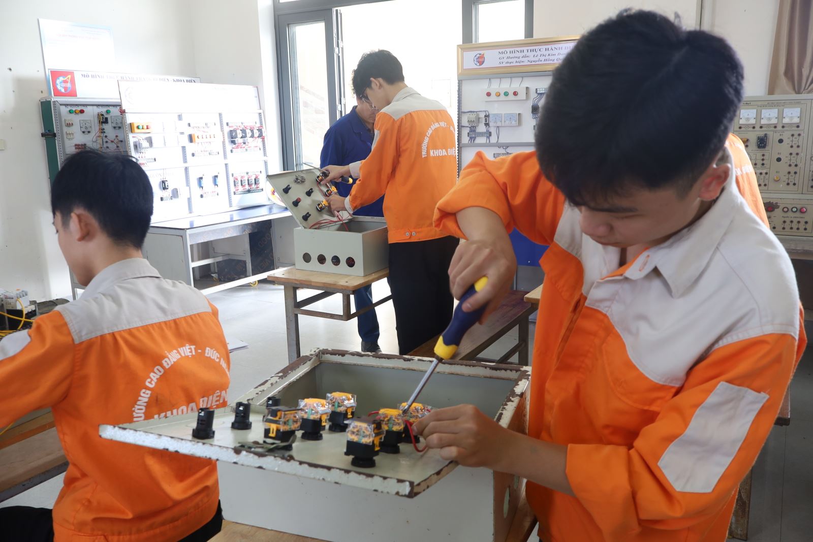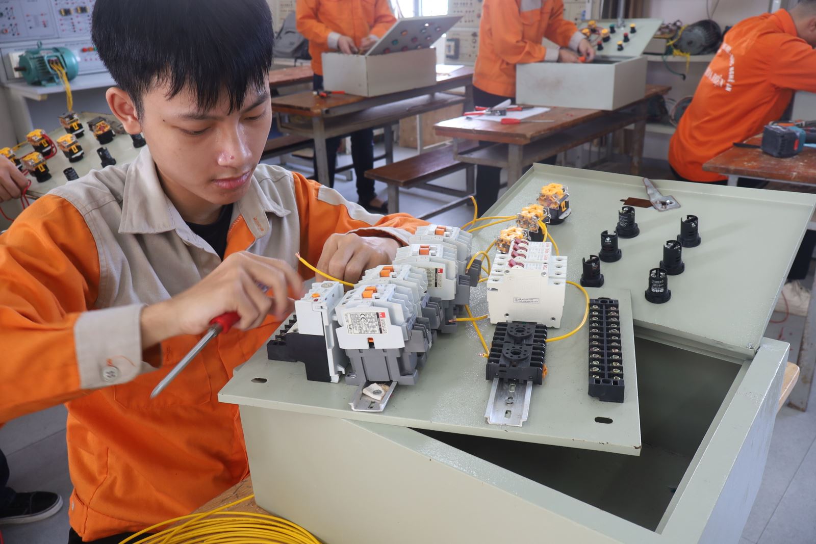 Các thí sinh dự thi thực hành nghề Điện công nghiệp. Ảnh: Trịnh Hường