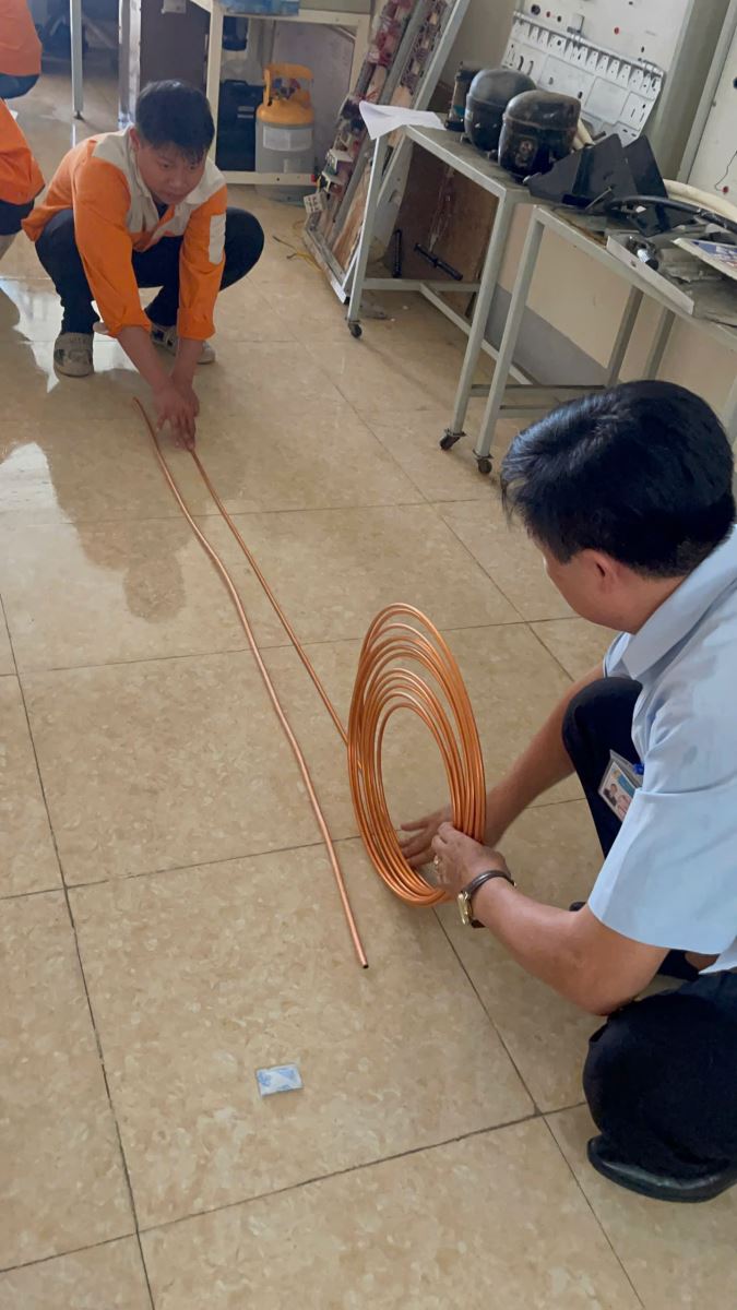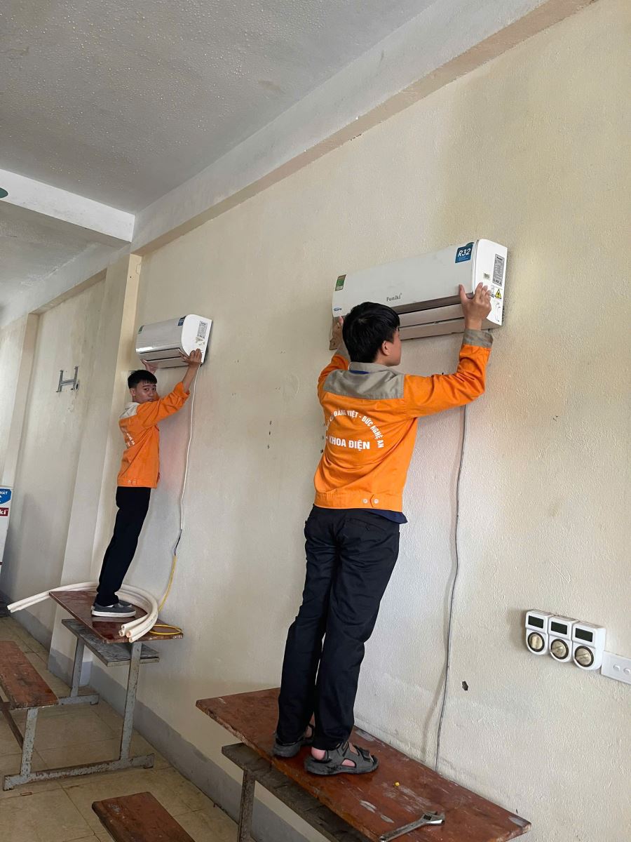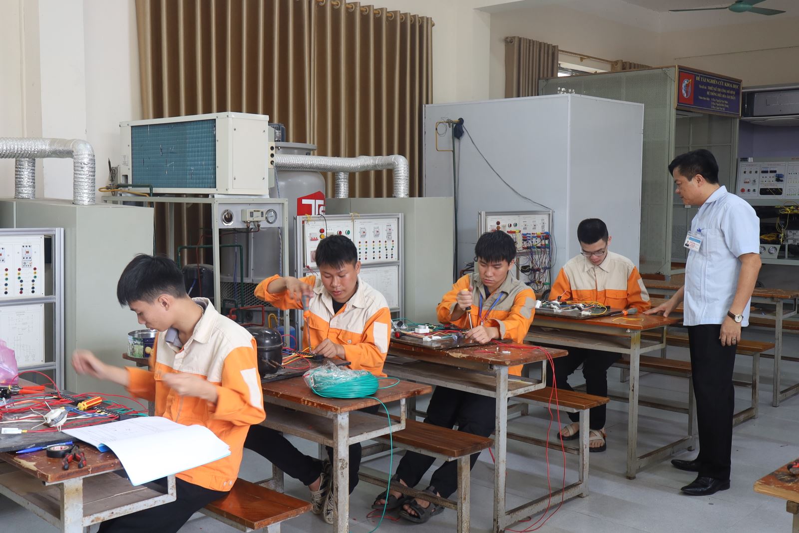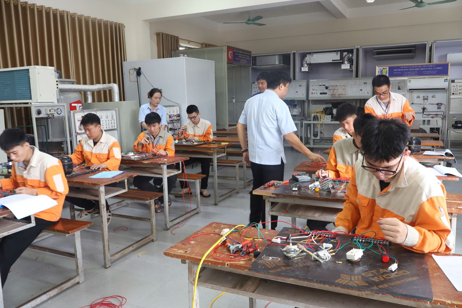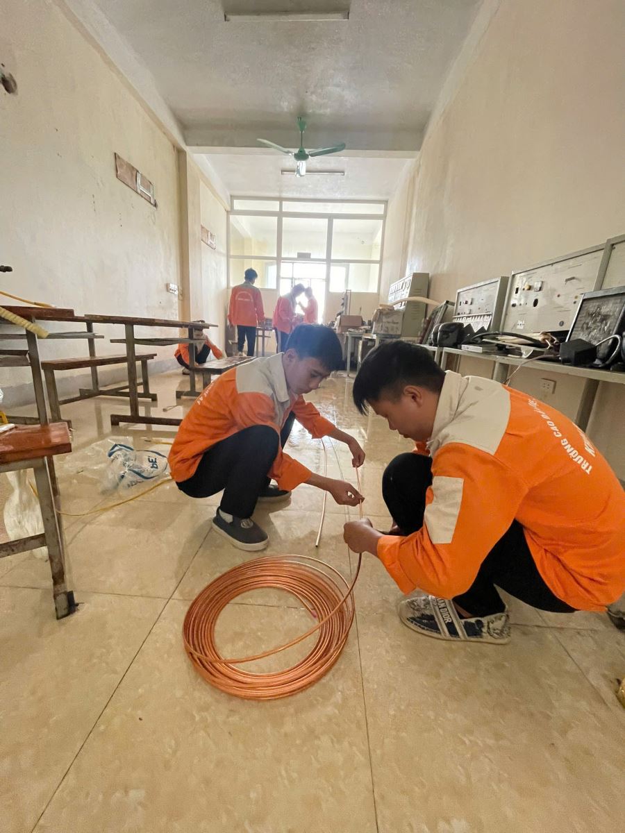 Các thí sinh dự thi thực hành nghề Kỹ thuật máy lạnh điều hòa không khí. Ảnh: Trịnh Hường