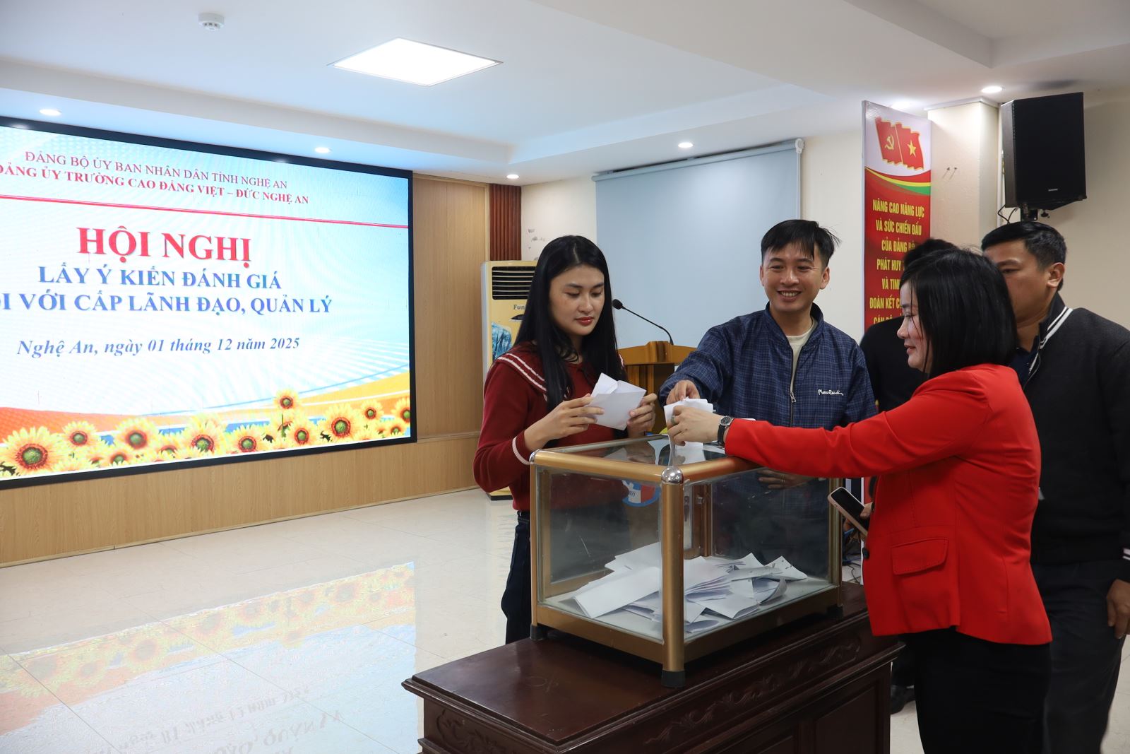 Sáng ngày 01/12/2025, Trường Cao đẳng Việt – Đức Nghệ An tổ chức Hội nghị lấy ý kiến đánh giá đối với cấp lãnh đạo, quản lý nhằm phát huy tinh thần dân chủ, minh bạch trong công tác cán bộ và nâng cao chất lượng điều hành trong toàn trường. Dự Hội nghị có ThS. Nguyễn Hữu Hằng – Bí thư Đảng ủy, Hiệu trưởng; ThS. Nguyễn Liêu – Phó Bí thư Đảng ủy, Trưởng phòng Công tác Học sinh sinh viên - Đảm bảo chất lượng; các đồng chí trong Đảng ủy, Ban Giám hiệu; trưởng, phó các phòng, khoa, đoàn thể cùng toàn thể cán bộ, viên chức, người lao động trong toàn trường.