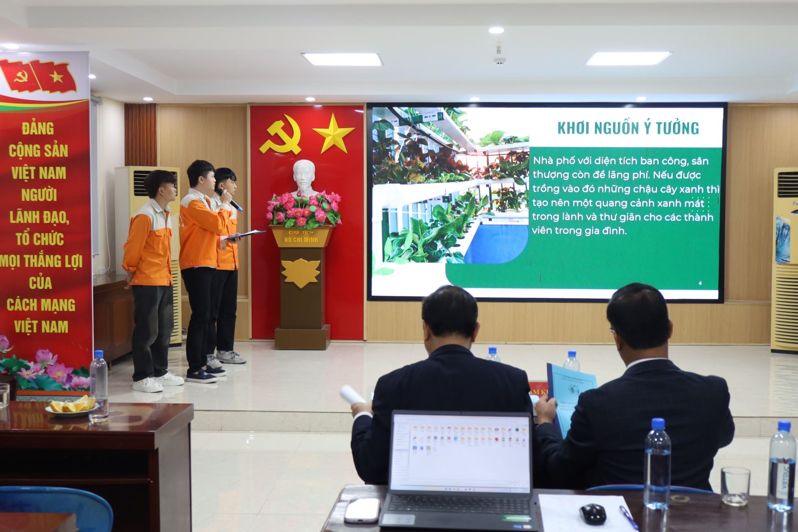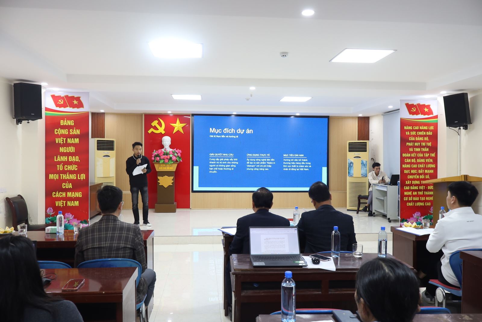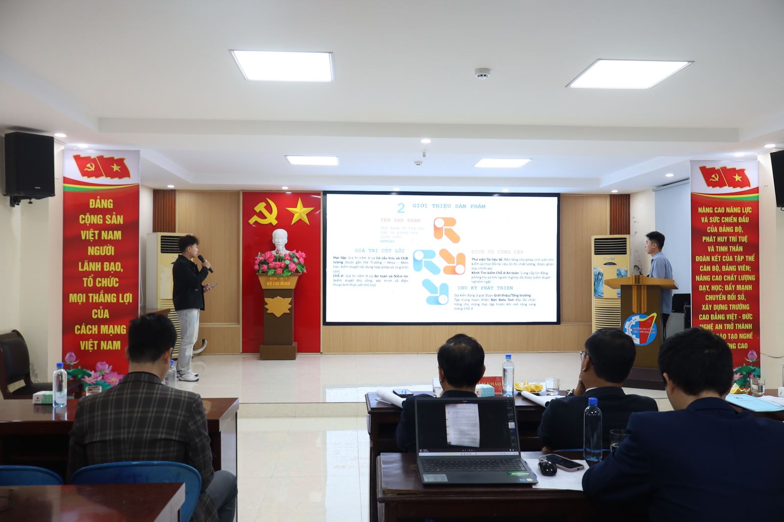 Về dự vòng Bán kết có ThS. Cao Anh Tuấn – Phó Hiệu trưởng, Chủ tịch Công đoàn trường; đại diện lãnh đạo Công ty New World, Công ty Hương Việt; đại diện lãnh đạo các phòng, khoa cùng các thầy giáo, cô giáo trong Ban Tổ chức; Ban Giám khảo; Ban Cố vấn; thành viên Câu lạc bộ Khởi nghiệp đổi mới sáng tạo và các tác giả các nhóm dự án.