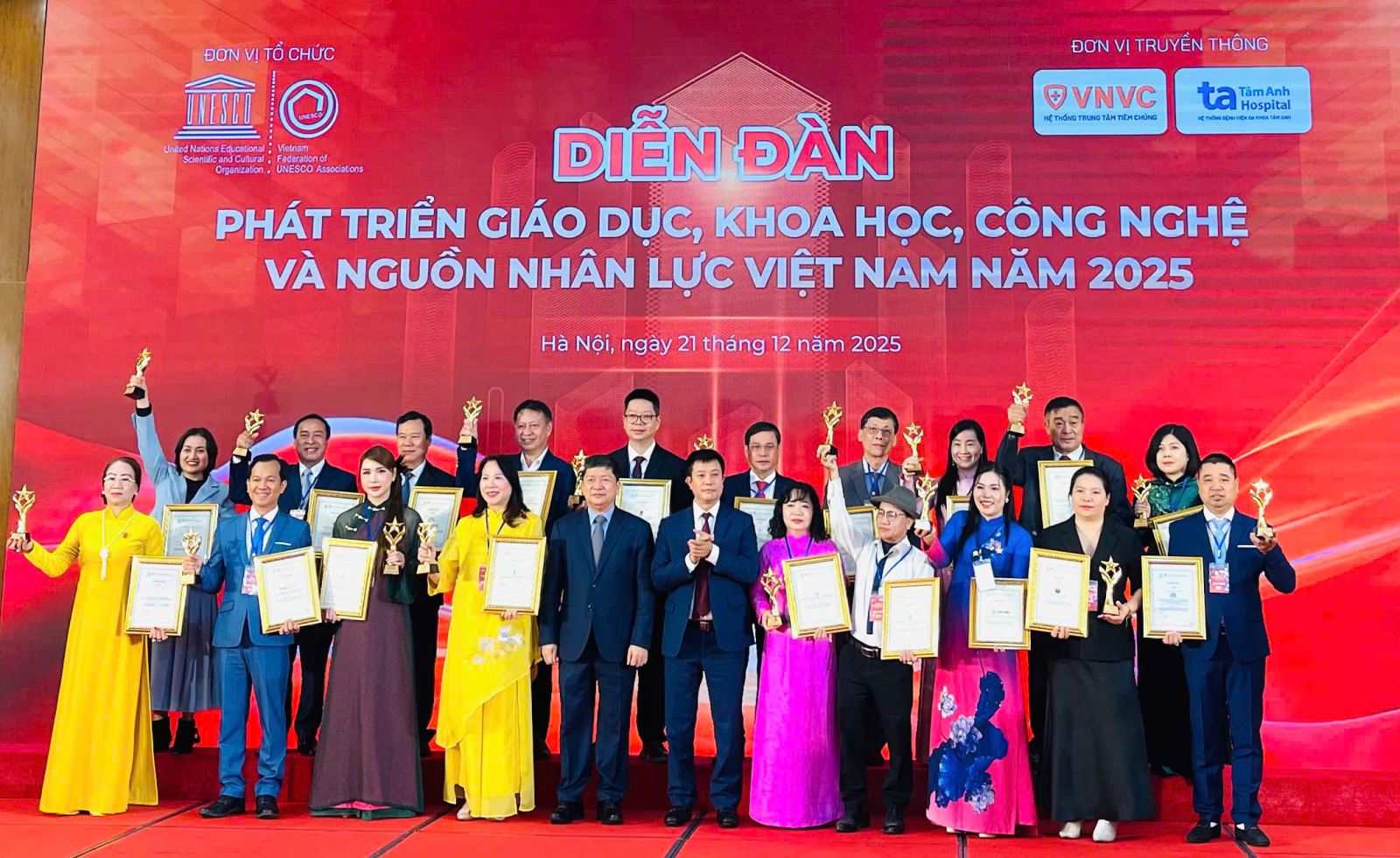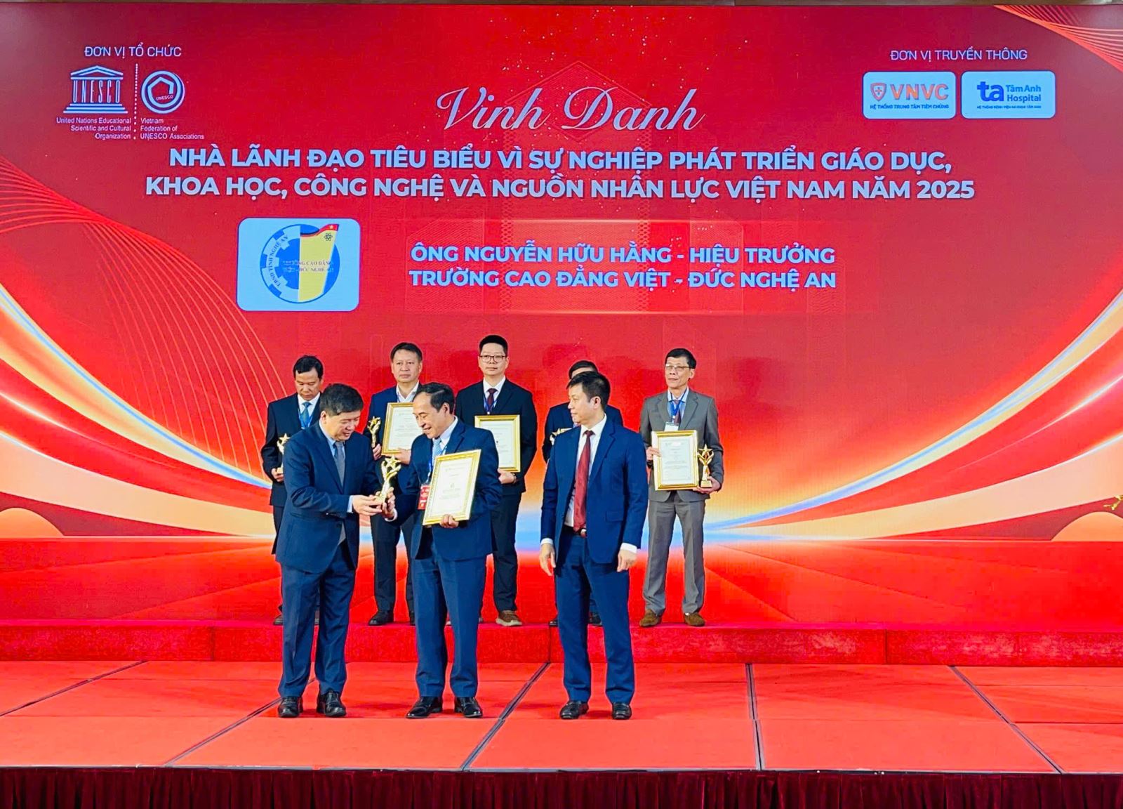 Sáng ngày 21/12/2025, tại Trung tâm Hội nghị Quốc tế, số 37, Hùng Vương, Ba Đình, Hà Nội, Trường Cao đẳng Việt – Đức Nghệ An vinh dự được Liên hiệp các Hội UNESCO Việt Nam vinh danh là Đơn vị tiêu biểu vì những đóng góp tích cực, bền bỉ trong sự nghiệp Giáo dục, Khoa học và Công nghệ. Cùng dịp này, ThS. Nguyễn Hữu Hằng – Bí thư Đảng uỷ, Hiệu trưởng Nhà trường cũng được vinh danh Danh hiệu “Nhà lãnh đạo tiêu biểu vì sự nghiệp phát triển Giáo dục, Khoa học, Công nghệ và nguồn nhân lực Việt Nam năm 2025”.