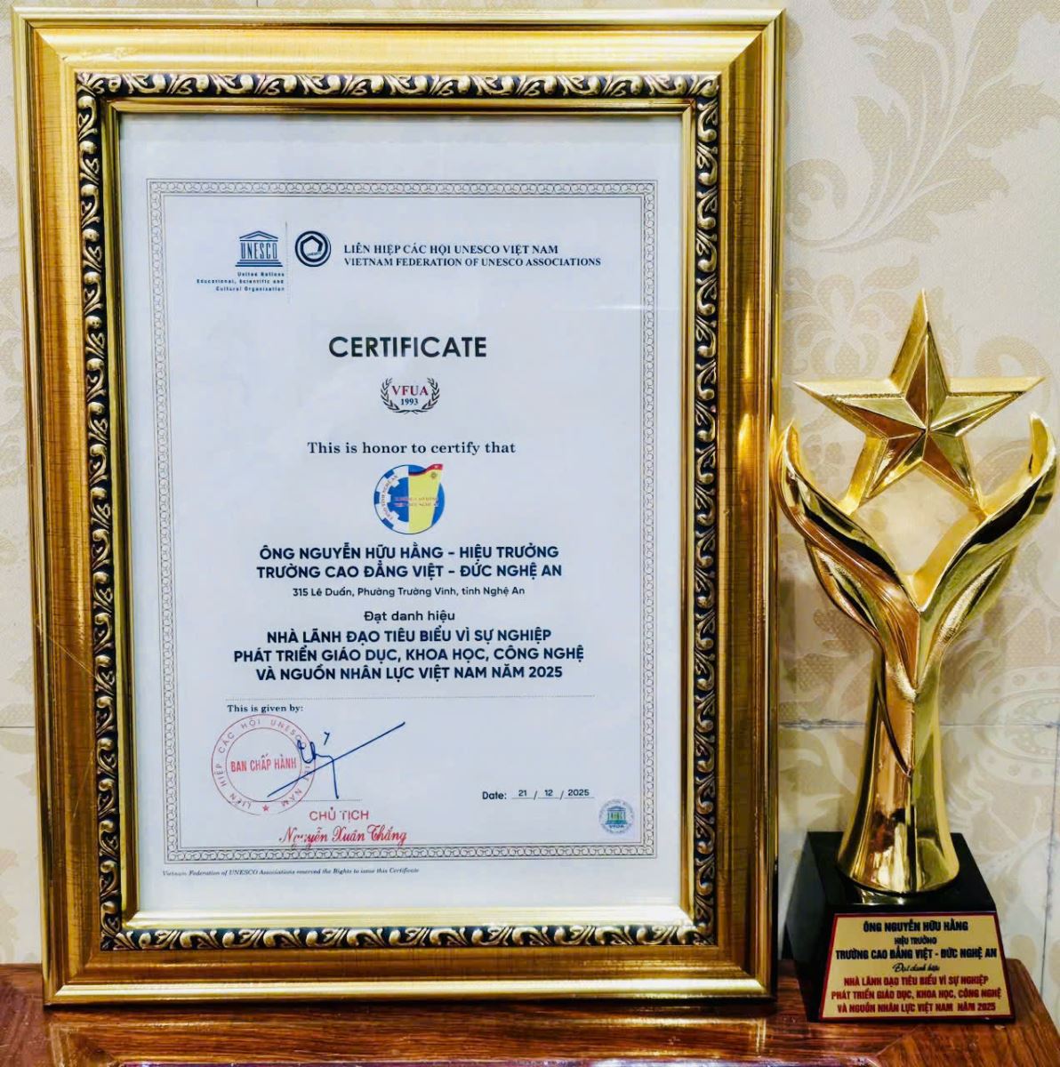 Trường Cao đẳng Việt – Đức Nghệ An được Liên hiệp các Hội UNESCO Việt Nam Vinh danh Đơn vị tiêu biểu và ThS. Nguyễn Hữu Hằng – Bí thư Đảng ủy, Hiệu trưởng được Vinh danh Nhà lãnh đạo tiêu biểu vì Sự nghiệp phát triển Giáo dục, Khoa học, Công nghệ và nguồn nhân lực Việt Nam năm 2025