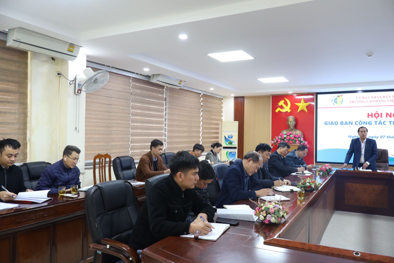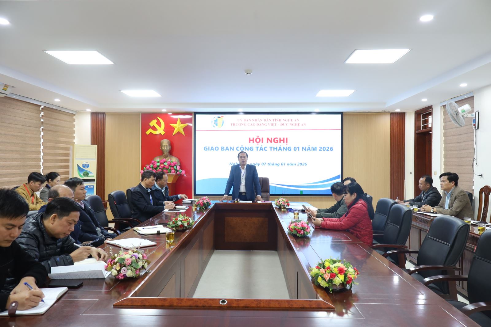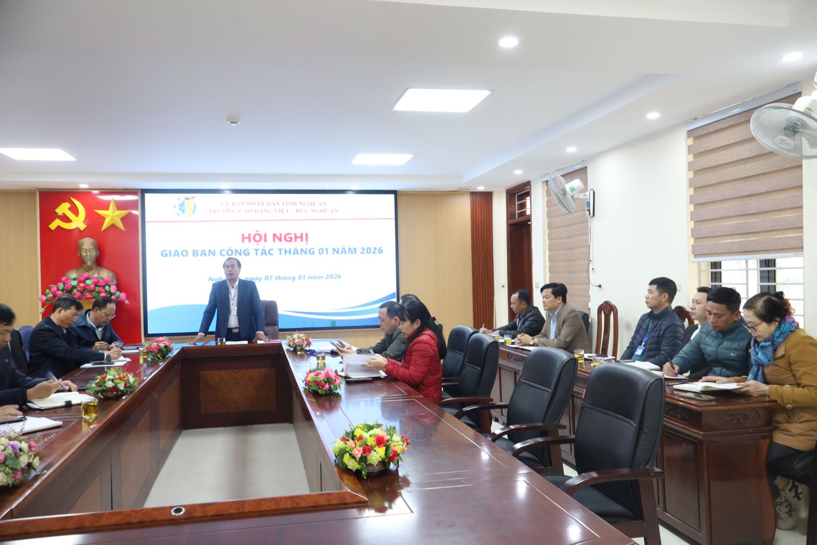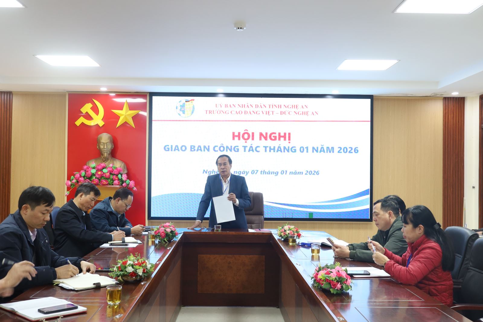 Chiều ngày 07/01/2026, Trường Cao đẳng Việt – Đức Nghệ An tổ chức Hội nghị Giao ban công tác tháng 01 nhằm đánh giá kết quả thực hiện nhiệm vụ tháng 12 và triển khai kế hoạch trọng tâm trong tháng 01 năm 2026. Tham dự Hội nghị có các đồng chí trong Đảng ủy; Ban Giám hiệu; trưởng, phó các đơn vị phòng, khoa, đoàn thể. ThS. Nguyễn Hữu Hằng – Bí thư Đảng ủy, Hiệu trưởng chủ trì Hội nghị.