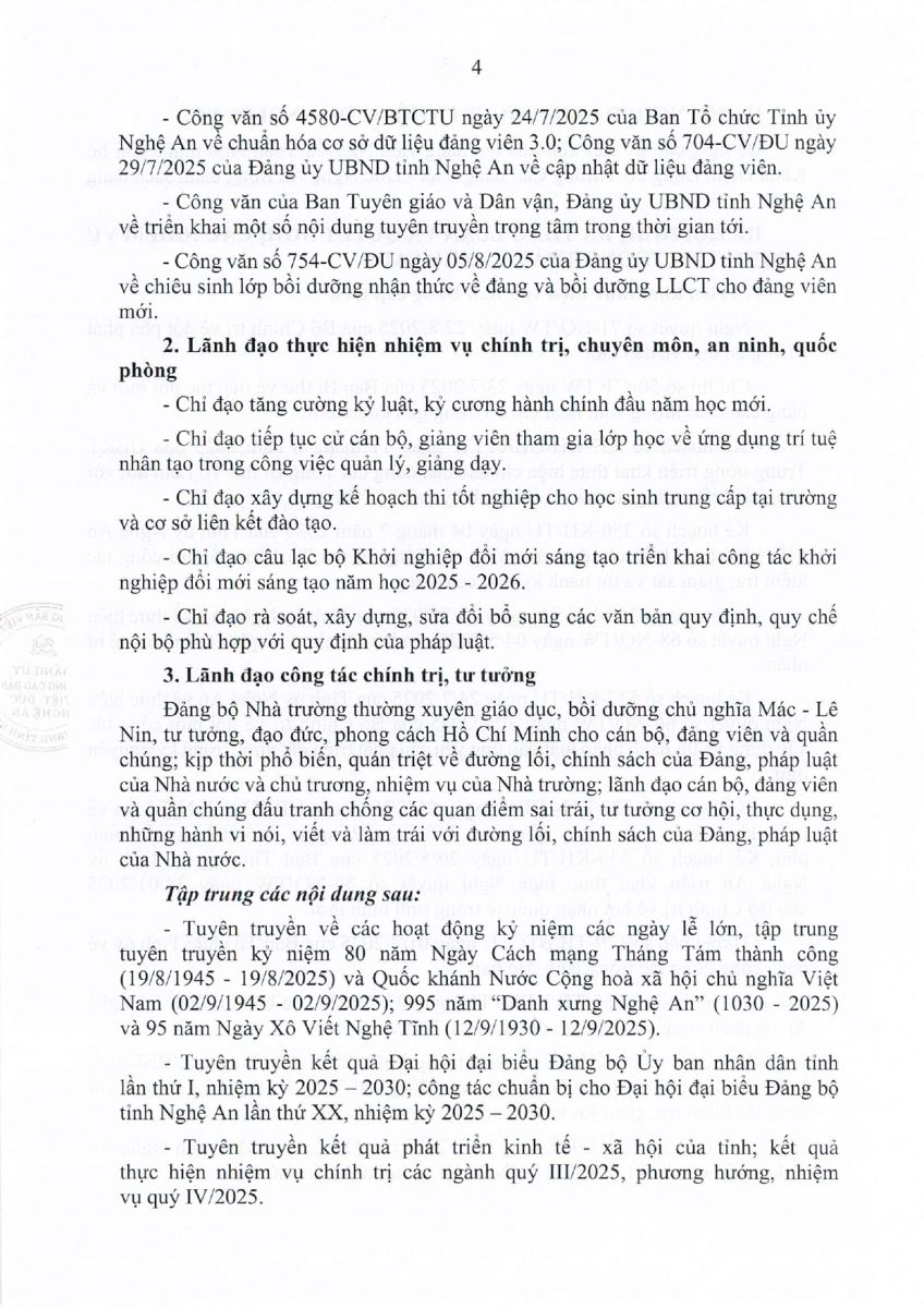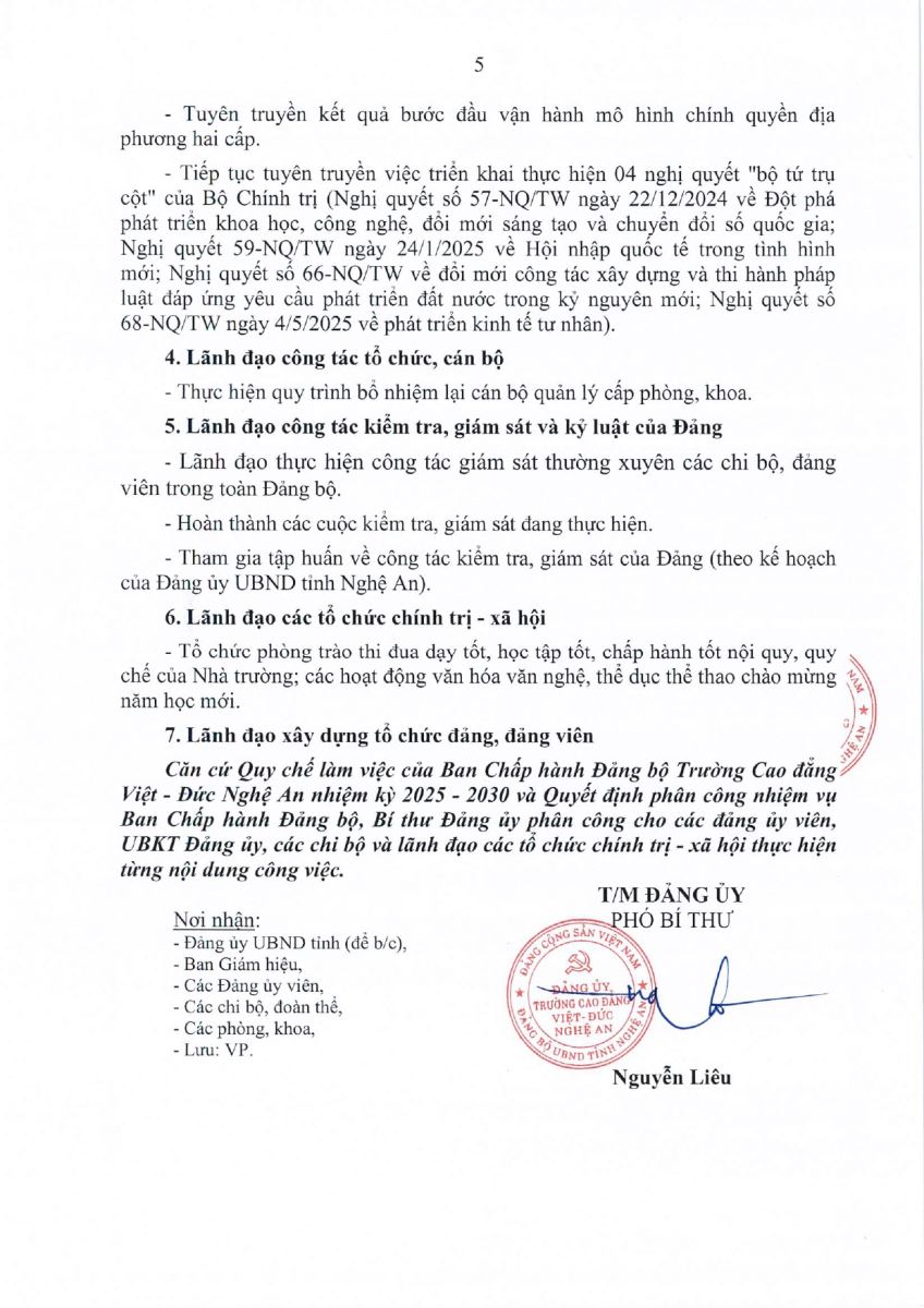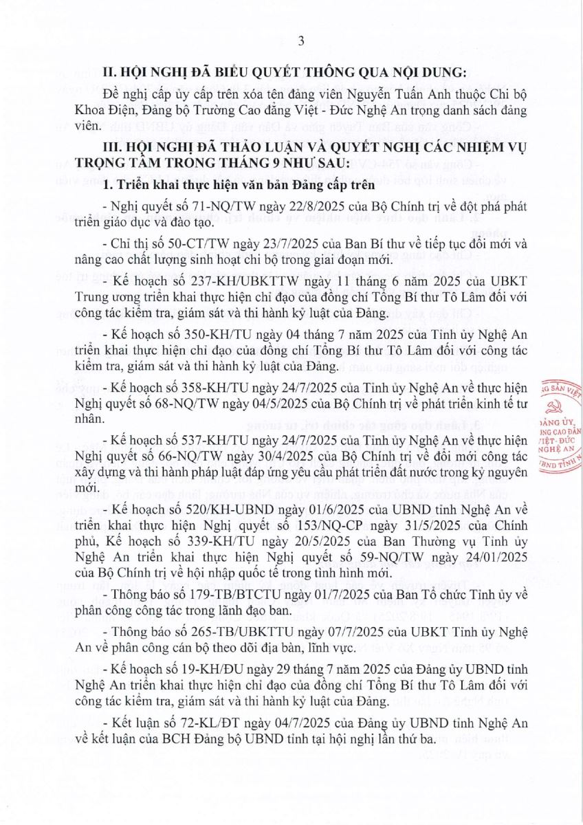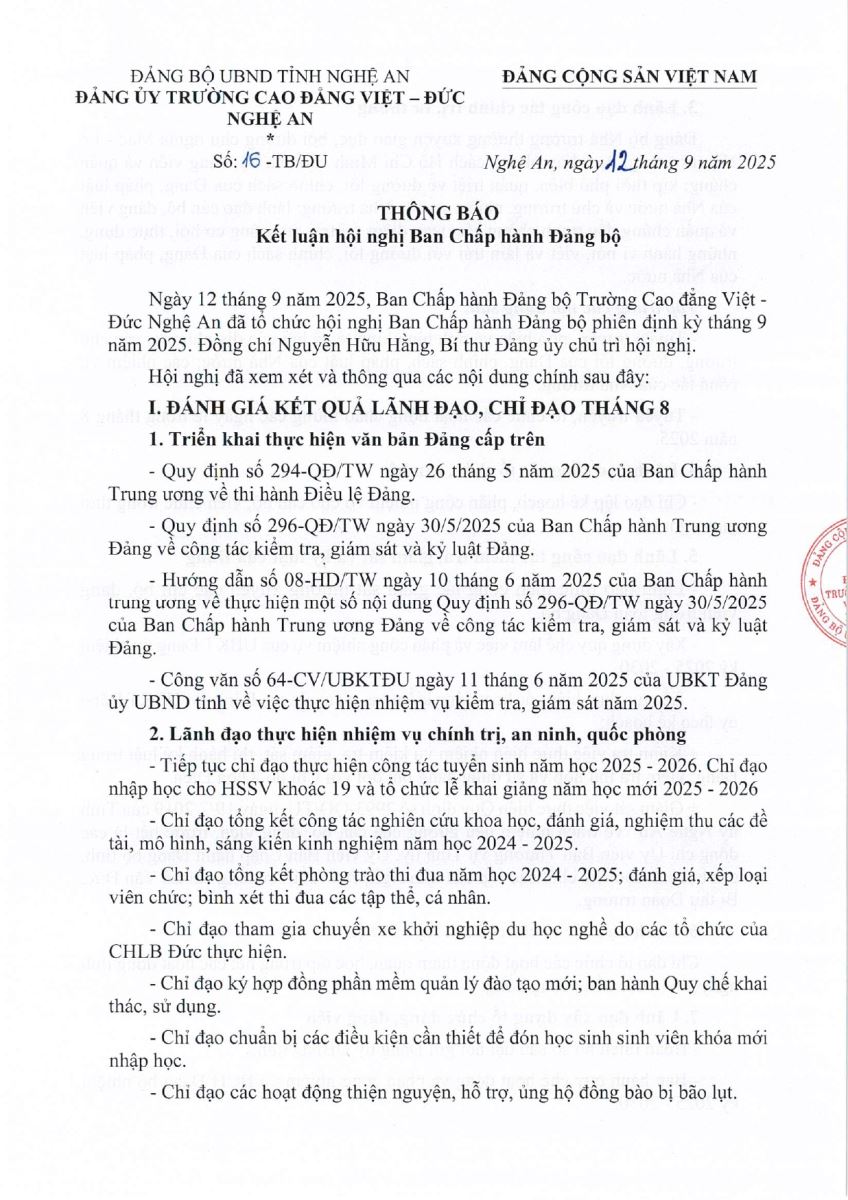 Thông báo Kết luận Hội nghị Ban Chấp hành Đảng bộ Trường Cao đẳng Việt - Đức Nghệ An, phiên định kỳ tháng 9 năm 2025