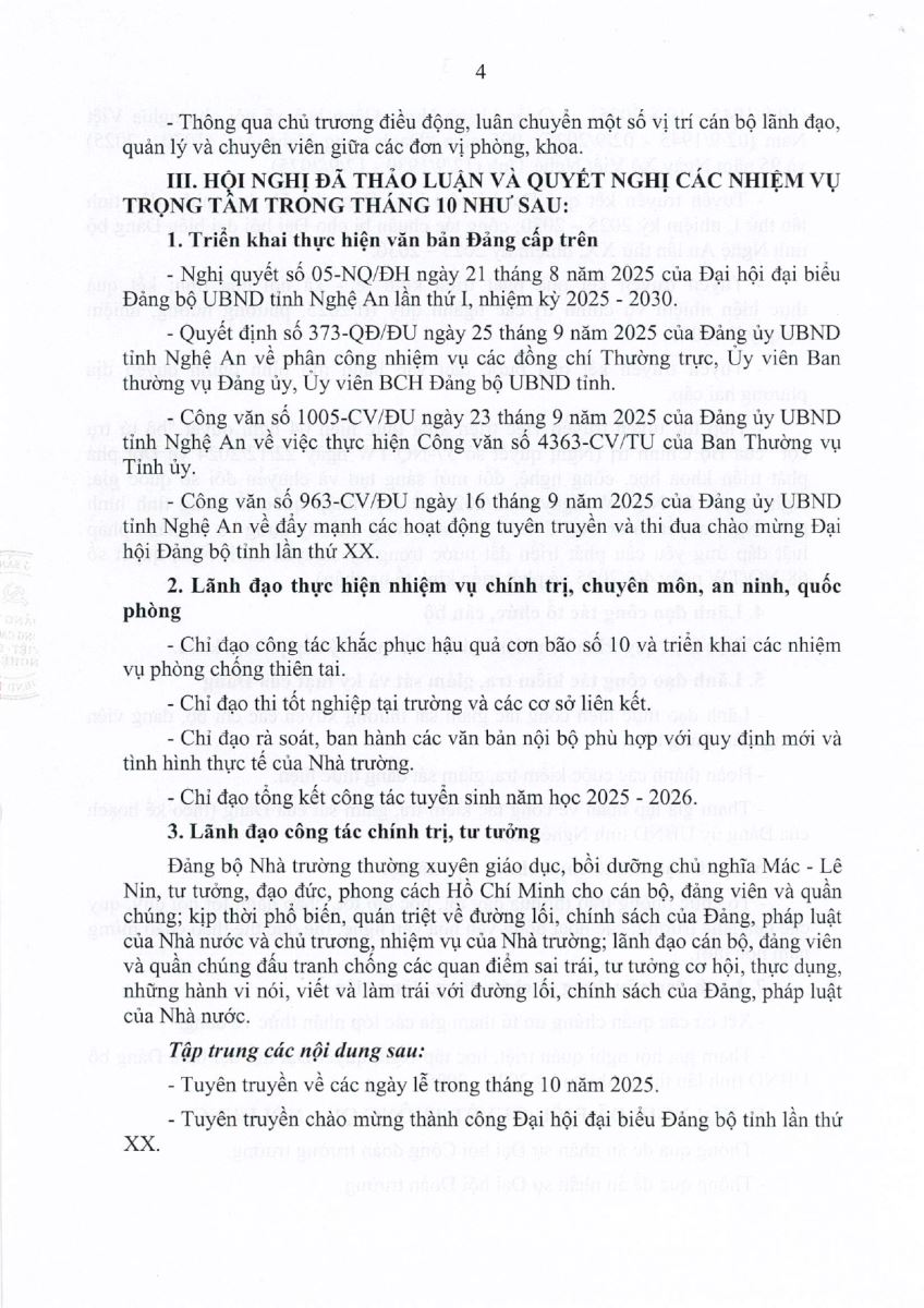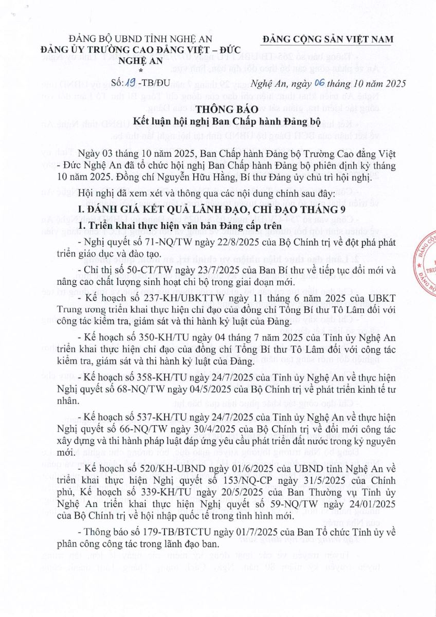 Thông báo Kết luận Hội nghị Ban Chấp hành Đảng bộ Trường Cao đẳng Việt - Đức Nghệ An, phiên định kỳ tháng 10 năm 2025