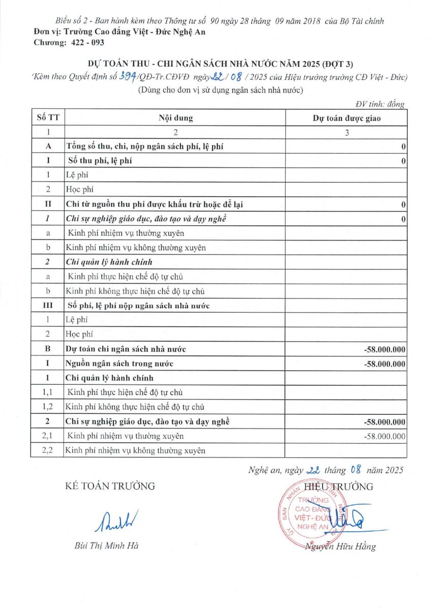 Quyết định số 394/QĐ-Tr.CĐVĐ ngày 22/8/2025 của Trường Cao đẳng Việt - Đức Nghệ An về việc Công bố công khai dự toán ngân sách năm 2025 (Đợt 3)