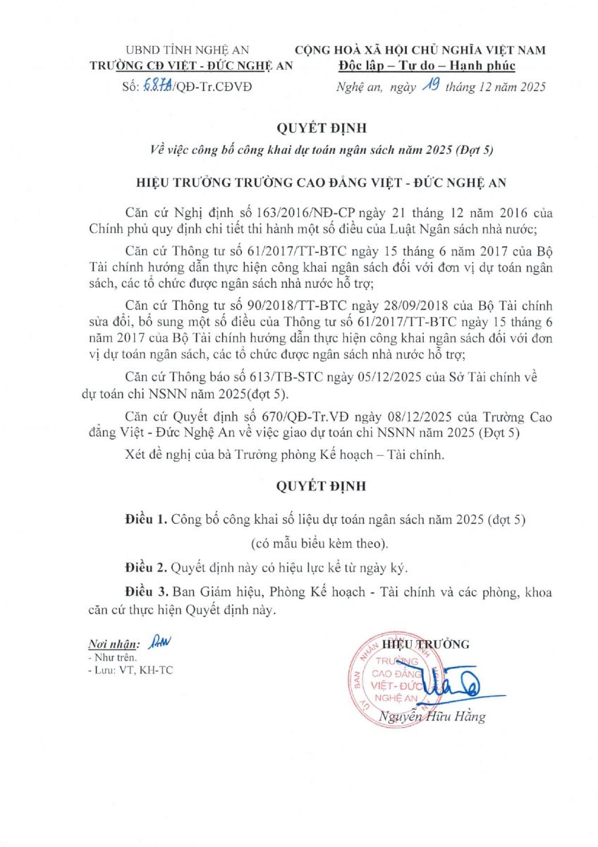 Quyết định số 687A/QĐ-Tr.CĐVĐ của Trường Cao đẳng Việt - Đức Nghệ An về việc Công bố Công khai dự toán ngân sách năm 2025 (Đợt 5)