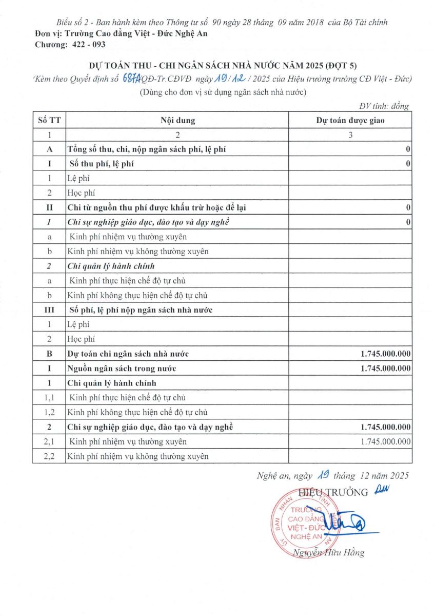 Quyết định số 285/QĐ-Tr.CĐVĐ ngày 26/6/2025 của Trường Cao đẳng Việt - Đức Nghệ An về việc Công bố công khai dự toán ngân sách năm 2025 (Đợt 2)