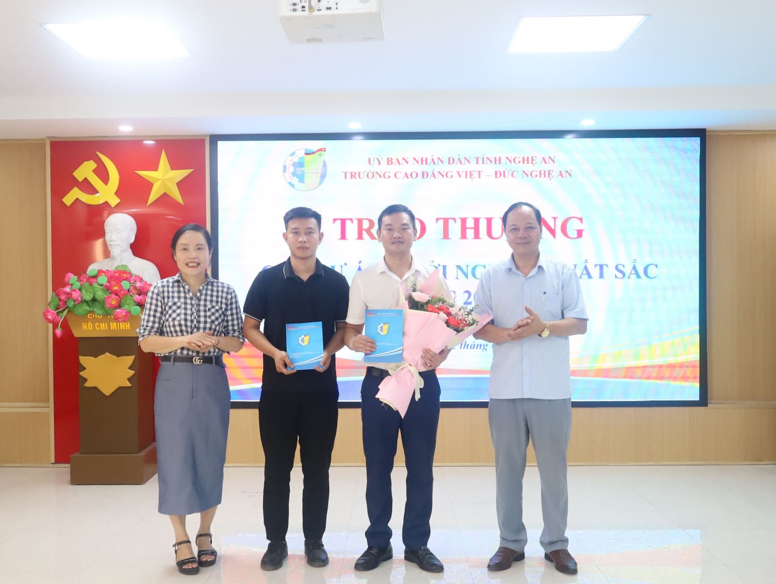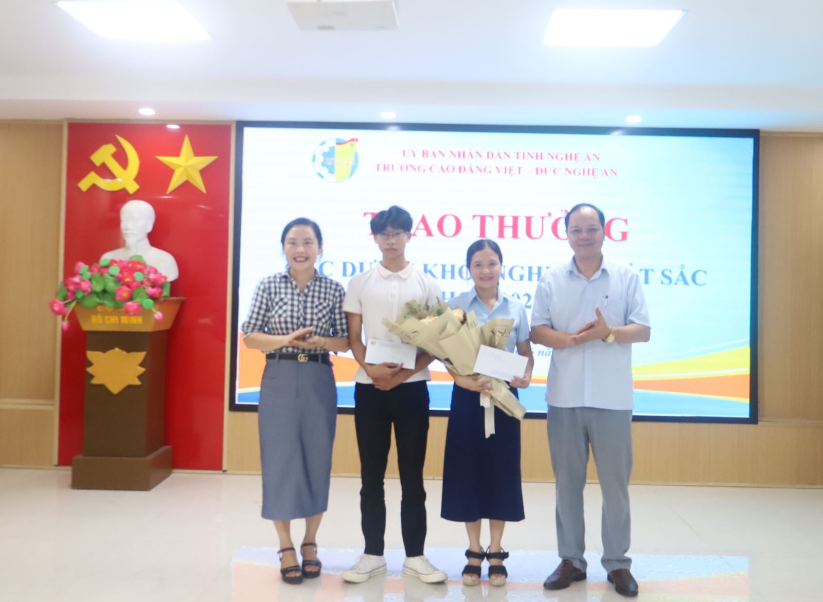 ThS. Cao Anh Tuấn - Phó Hiệu trưởng, Chủ tịch Công đoàn trường trao thưởng của UBND tỉnh cho nhóm Dự án "Chuỗi cửa hàng Chè đâm quán" đạt giải Khuyến khích do giảng viên hướng dẫn Hoàng Văn Tiến và các sinh viên Hồ Đức Nhật, Bùi Quang Nhật, Lữ Văn Linh thực hiện. Ảnh: Trịnh Hường
