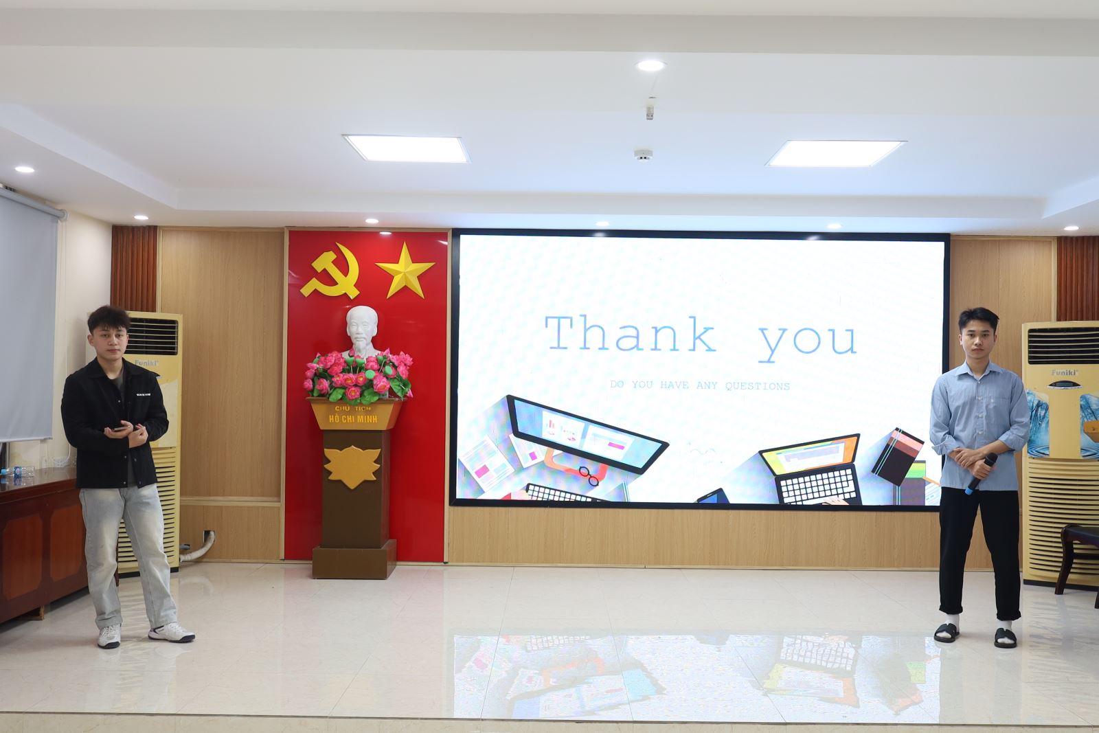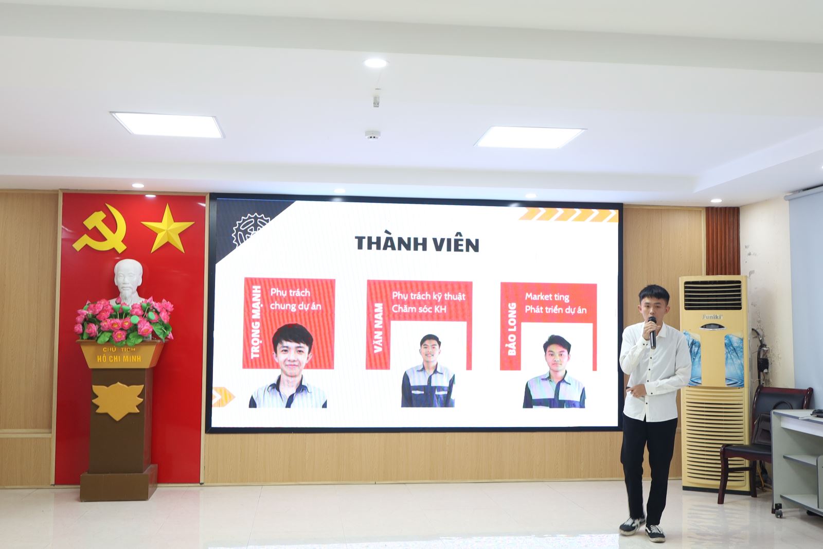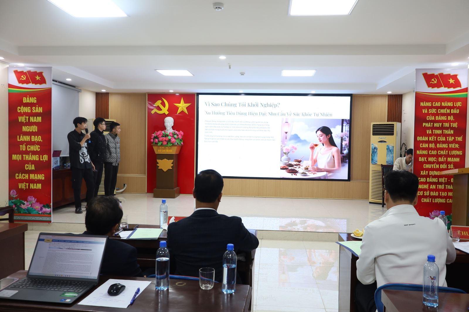 Về dự vòng Bán kết có ThS. Cao Anh Tuấn – Phó Hiệu trưởng, Chủ tịch Công đoàn trường; đại diện lãnh đạo Công ty New World, Công ty Hương Việt; đại diện lãnh đạo các phòng, khoa cùng các thầy giáo, cô giáo trong Ban Tổ chức; Ban Giám khảo; Ban Cố vấn; thành viên Câu lạc bộ Khởi nghiệp đổi mới sáng tạo và các tác giả các nhóm dự án.