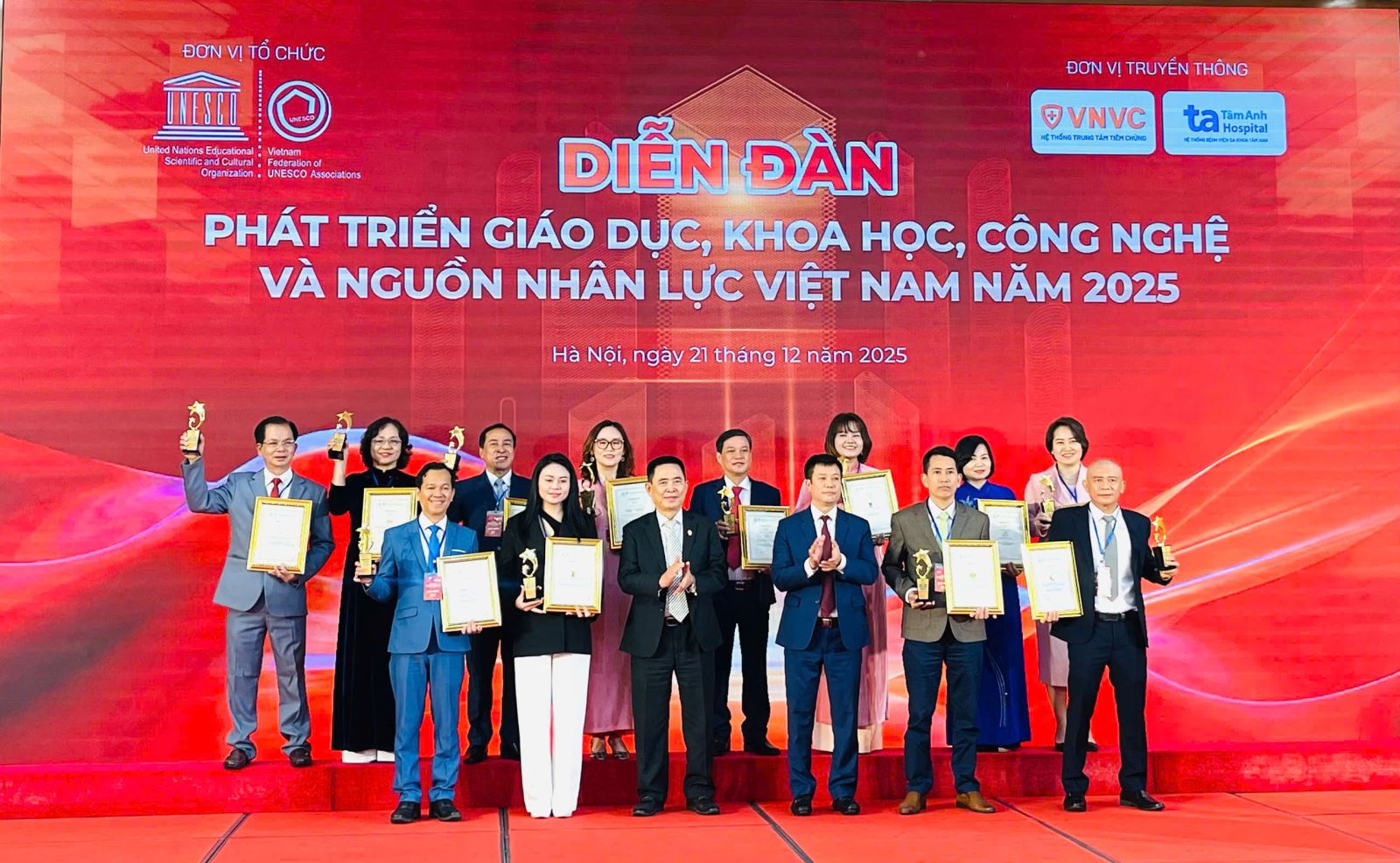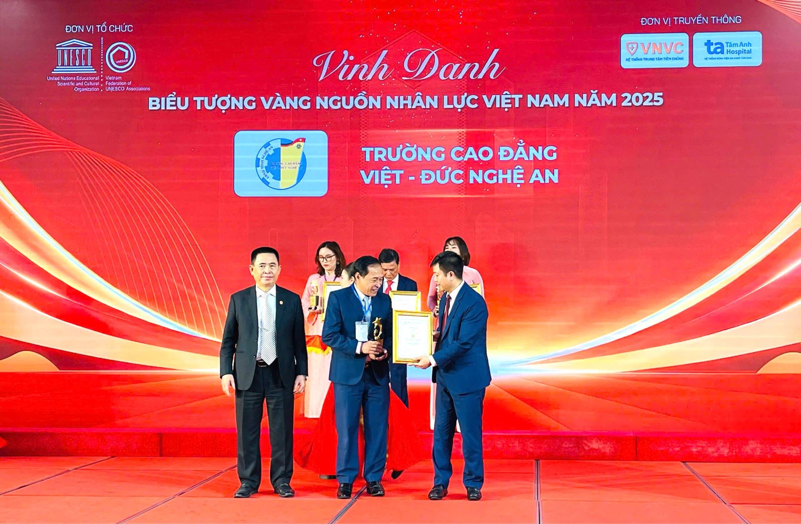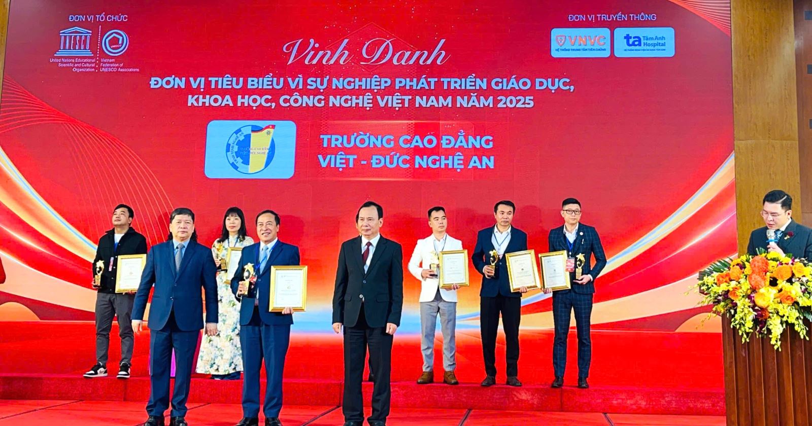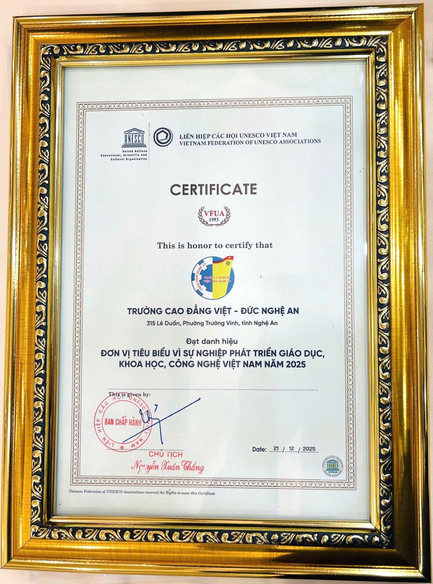 Sáng ngày 21/12/2025, tại Trung tâm Hội nghị Quốc tế, số 37, Hùng Vương, Ba Đình, Hà Nội, Trường Cao đẳng Việt – Đức Nghệ An vinh dự được Liên hiệp các Hội UNESCO Việt Nam vinh danh là Đơn vị tiêu biểu vì những đóng góp tích cực, bền bỉ trong sự nghiệp Giáo dục, Khoa học và Công nghệ. Cùng dịp này, ThS. Nguyễn Hữu Hằng – Bí thư Đảng uỷ, Hiệu trưởng Nhà trường cũng được vinh danh Danh hiệu “Nhà lãnh đạo tiêu biểu vì sự nghiệp phát triển Giáo dục, Khoa học, Công nghệ và nguồn nhân lực Việt Nam năm 2025”.