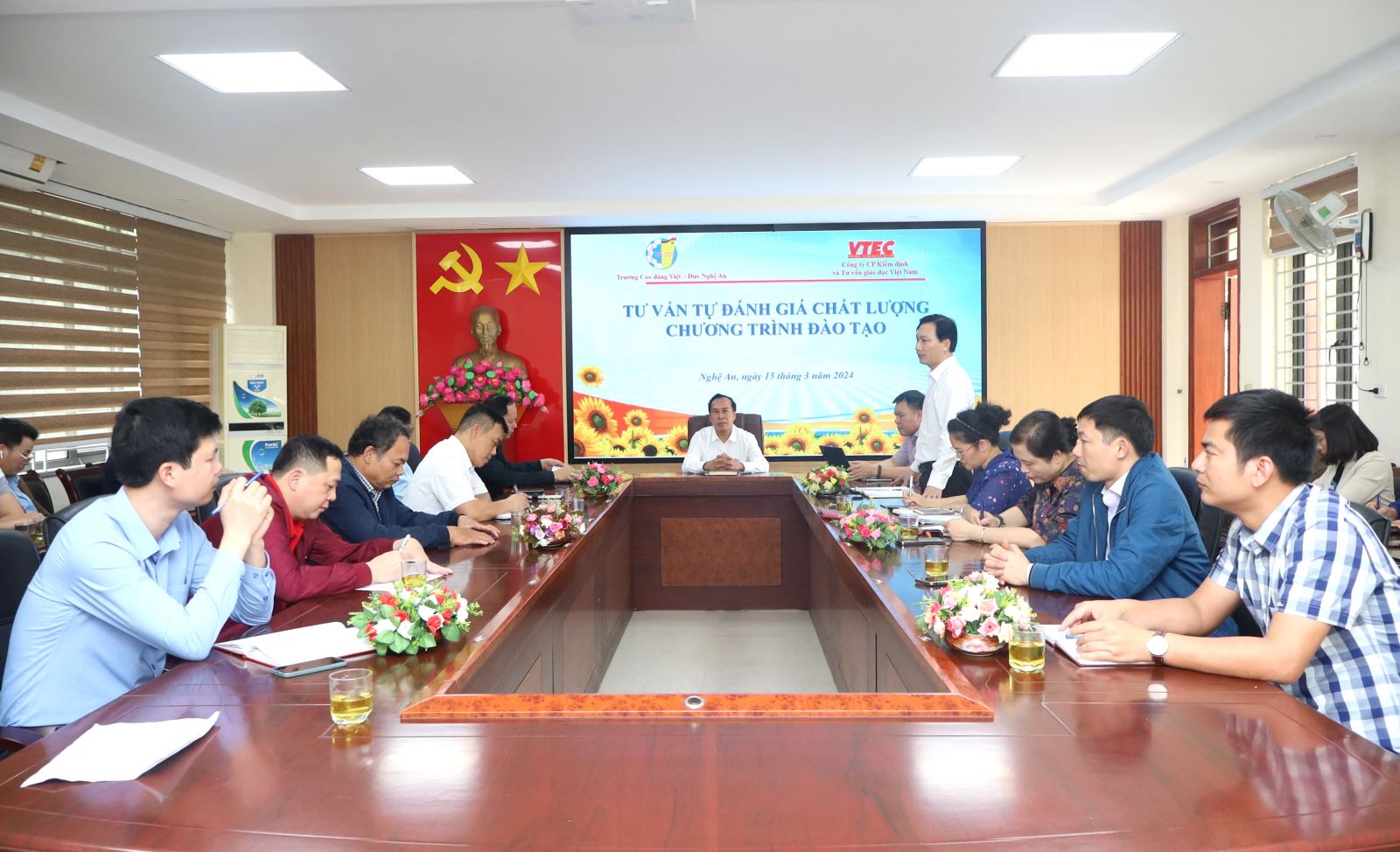 Chiều ngày 15/3/2024, Trường Cao đẳng Việt – Đức Nghệ An đã tổ chức Hội nghị tập huấn công tác tự đánh giá các tiêu chuẩn kiểm định chất lượng Chương trình đào tạo. Tham dự Hội nghị có các đồng chí trong Đảng ủy, Ban Giám hiệu, Hội đồng tự đánh giá chất lượng Chương trình đào tạo các nghề đầu tư trọng điểm; trưởng, phó các phòng khoa, đoàn thể và giảng viên các Khoa nghề. Tham dự và tư vấn công tác tự đánh giá có TS. Nguyễn Mạnh Cường – Phó Giám đốc Công ty Cổ phần Kiểm định và Tư vấn giáo dục Việt Nam. ThS. Nguyễn Hữu Hằng – Bí thư Đảng ủy, Chủ tịch Hội đồng trường, Hiệu trưởng, Chủ tịch Hội đồng tự đánh giá chủ trì Hội nghị.