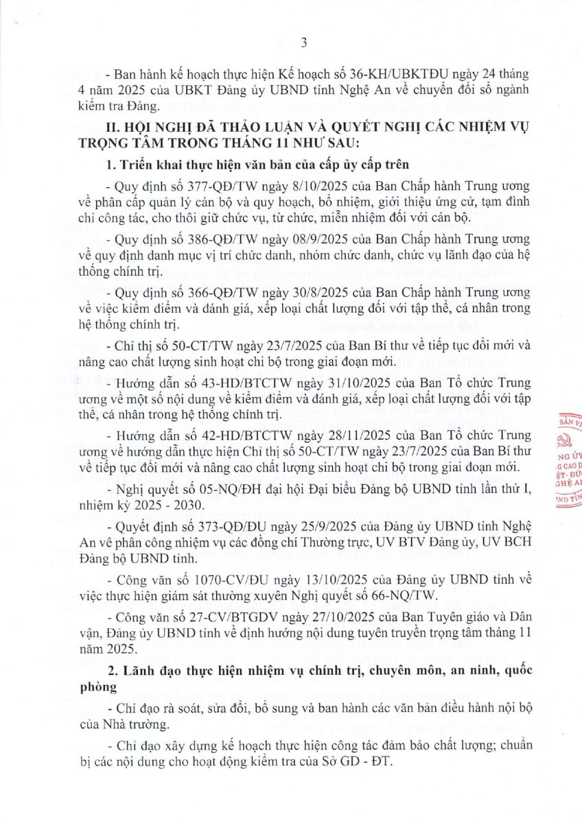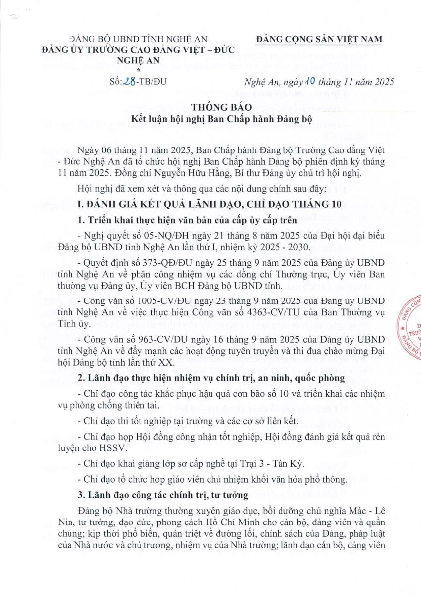 Thông báo Kết luận Hội nghị Ban Chấp hành Đảng bộ Trường Cao đẳng Việt - Đức Nghệ An, phiên định kỳ tháng 11 năm 2025