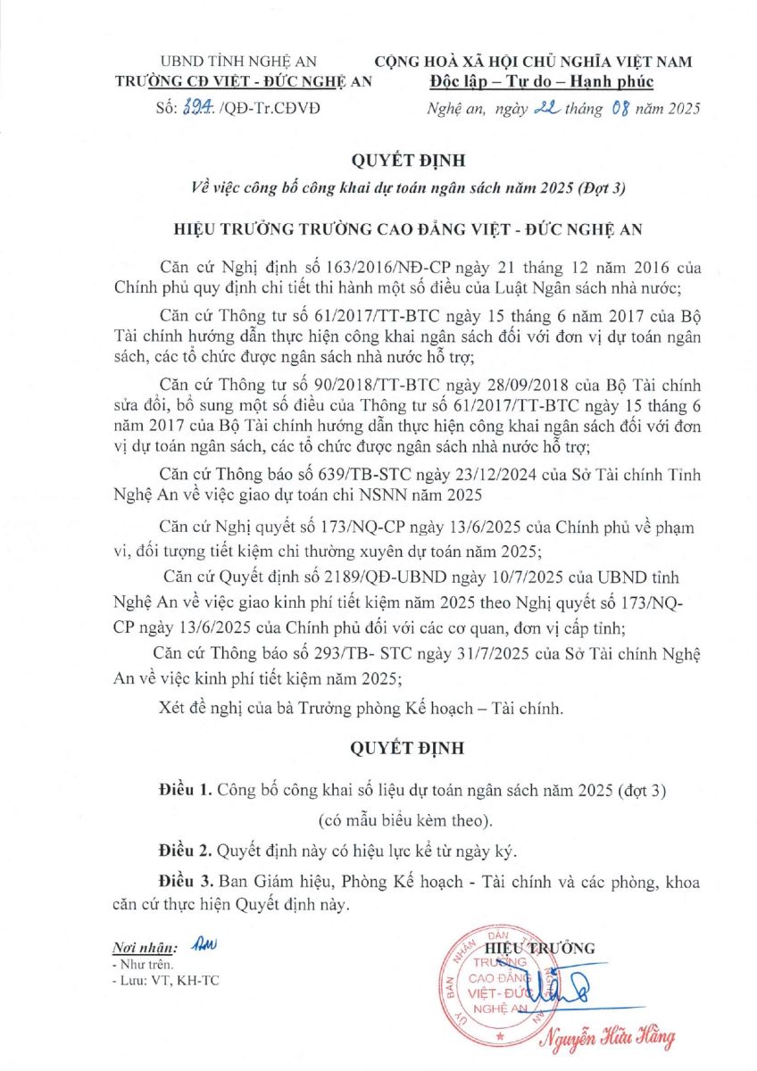 Quyết định số 394/QĐ-Tr.CĐVĐ ngày 22/8/2025 của Trường Cao đẳng Việt - Đức Nghệ An về việc Công bố công khai dự toán ngân sách năm 2025 (Đợt 3)