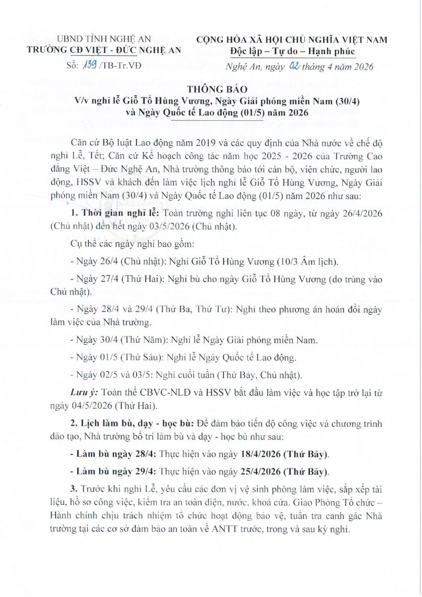 Thông báo số 139/TB- Tr.VĐ của Trường Cao đẳng Việt - Đức Nghệ An về việc Nghỉ lễ Giỗ Tổ Hùng Vương, Ngày Giải phóng miền Nam (30/4) và Ngày Quốc tế Lao động (01/5) năm 2026