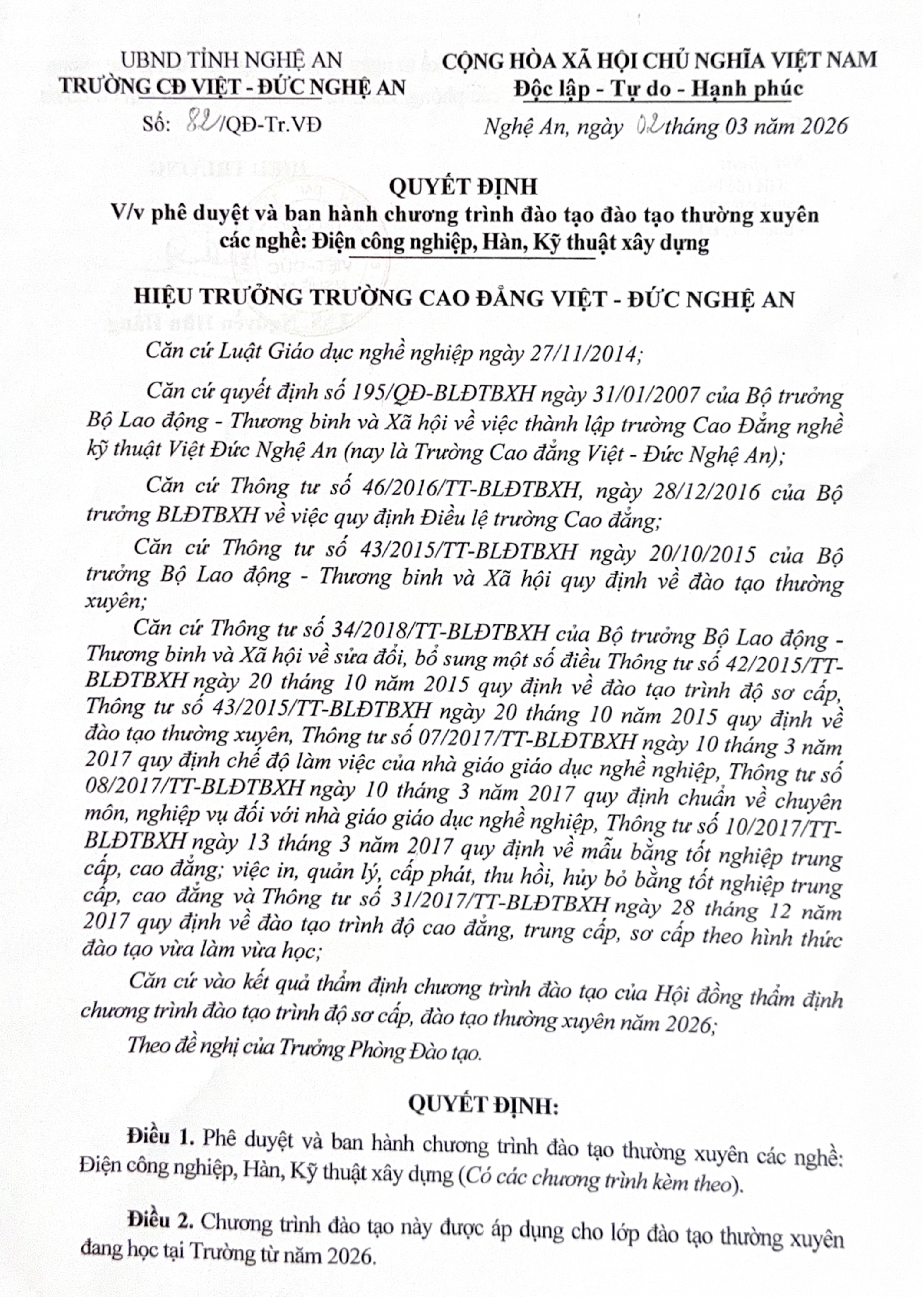 1 - Quyết định số 82 của Trường Cao đẳng Việt - Đức Nghệ An về việc phê duyệt và ban hành Chương trình Đào tạo thường xuyên các nghề: Điện công nghiệp, Hàn và Kỹ thuật Xây dựngNew