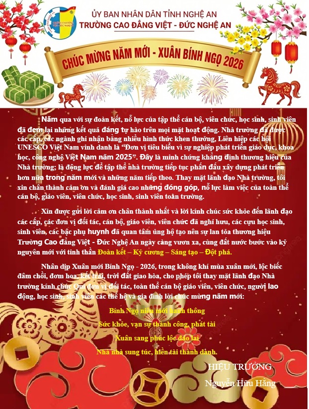 THƯ CHÚC TẾT CỦA ThS. NGUYỄN HỮU HẰNG - BÍ THƯ ĐẢNG ỦY, HIỆU TRƯỞNG TRƯỜNG CAO ĐẲNG VIỆT - ĐỨC NGHỆ AN!