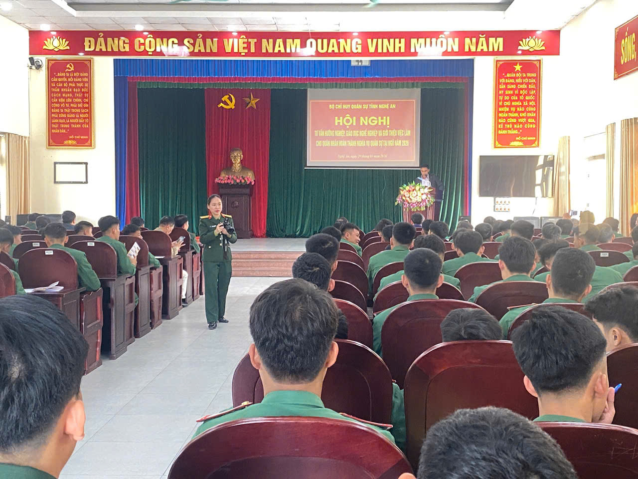 Thực hiện kế hoạch tuyển sinh năm học 2025 – 2026, chiều ngày 29/01/2026, phối hợp với Bộ Chỉ huy Quân sự tỉnh Nghệ An, Trường Cao đẳng Việt – Đức Nghệ An đã có buổi tọa đàm tư vấn tuyển sinh, hướng nghiệp cho hạ sĩ quan, binh sĩ hoàn thành nghĩa vụ quân sự năm 2026. Tham dự Hội nghị có đại diện lãnh đạo Bộ Chỉ huy Quân sự tỉnh Nghệ An; đại diện lãnh đạo Sở Nội vụ; Sở Giáo dục và Đào tạo tỉnh Nghệ An; ThS. Cao Anh Tuấn – Đảng ủy viên, Phó Hiệu trưởng, Chủ tịch Công đoàn trường; các thầy, cô giáo trong Ban tuyển sinh và hơn 150 hạ sĩ quan, binh sĩ xuất ngũ năm 2026.
