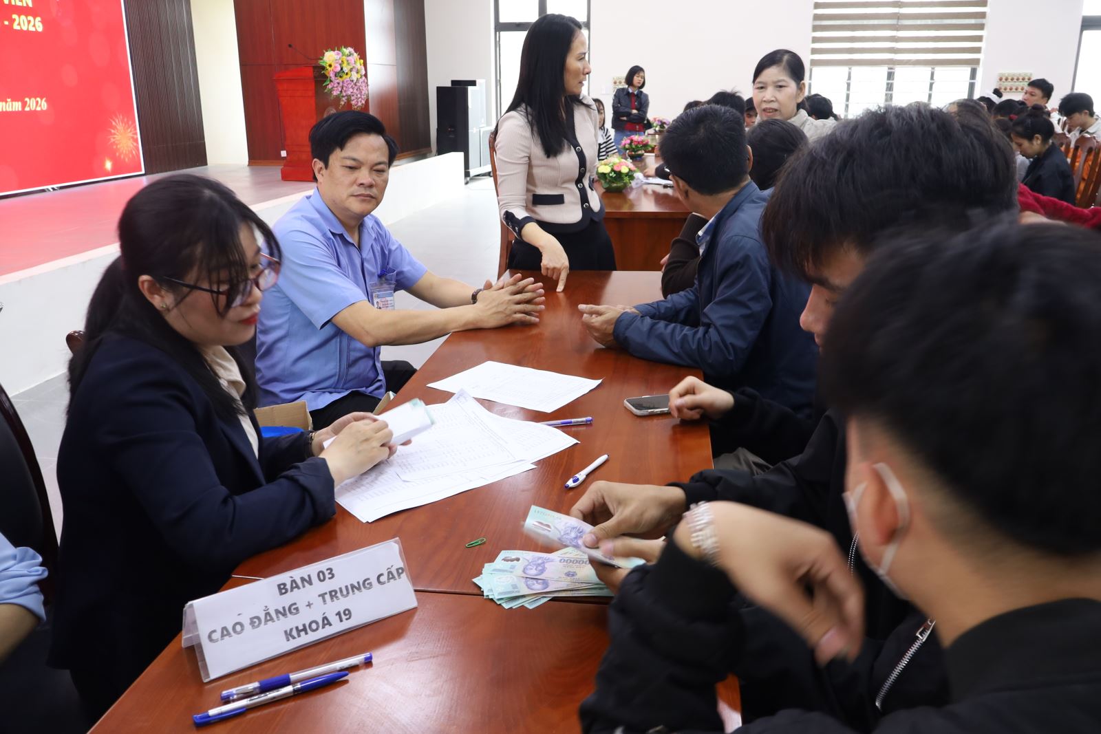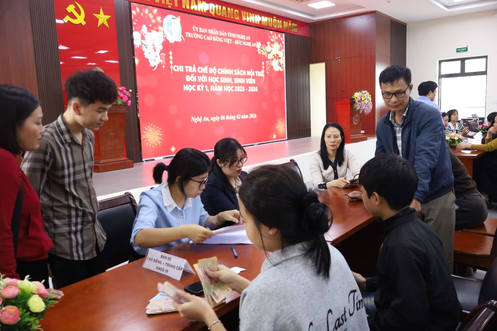 Nhằm kịp thời bảo đảm quyền lợi và tạo điều kiện thuận lợi để học sinh, sinh viên yên tâm học tập, sinh hoạt trong dịp Tết Nguyên đán, Trường Cao đẳng Việt – Đức Nghệ An đã tổ chức cấp phát các khoản chế độ chính sách học kỳ I, năm học 2025 – 2026 cho học sinh, sinh viên theo đúng quy định. Tham dự chương trình có ThS. Cao Anh Tuấn – Phó Hiệu trưởng, Chủ tịch Công đoàn trường; đại diện lãnh đạo các phòng, khoa, đoàn thể; phụ huynh và học sinh, sinh viên được nhận chế độ.