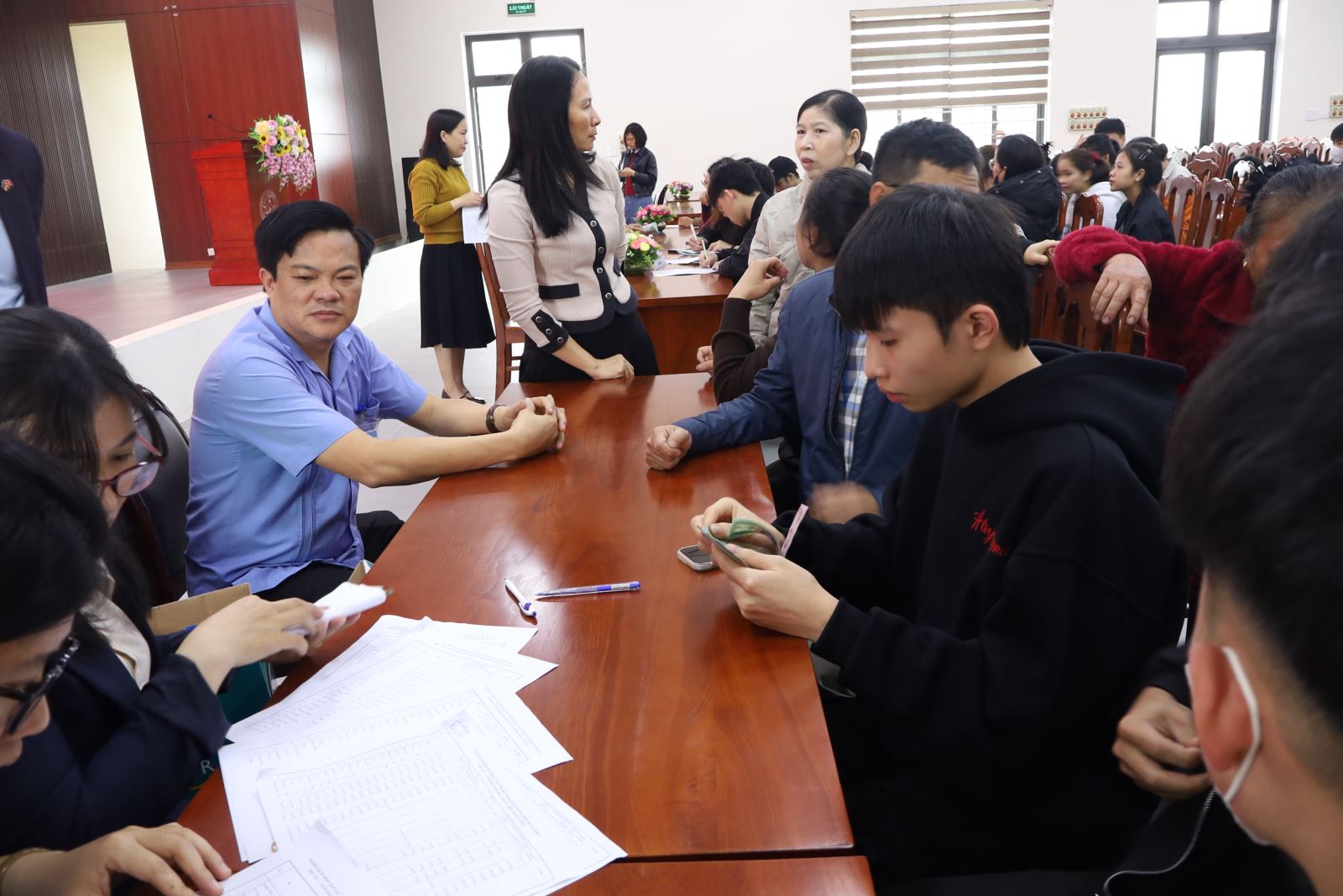 Phụ huynh và HSSV nhận tiền chế độ chính sách tại Chương trình. Ảnh: Trịnh Hường