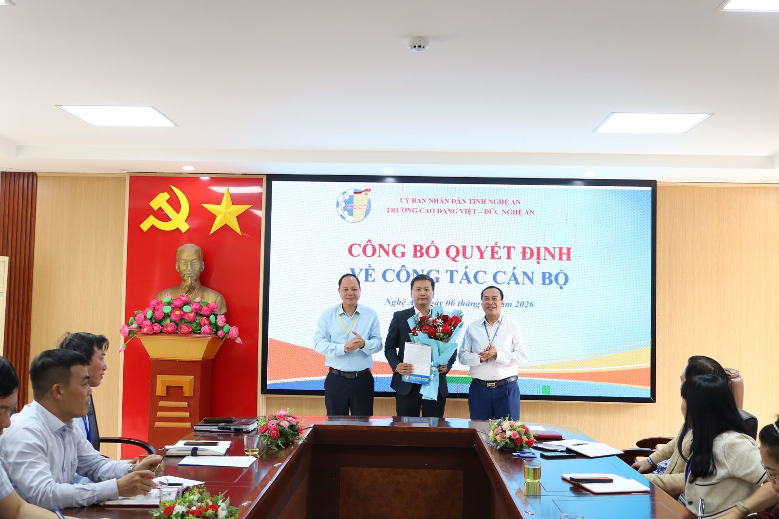 Chiều ngày 06/02/2026, Trường Cao đẳng Việt – Đức Nghệ An đã tổ chức Hội nghị Giao ban công tác tháng 02 năm 2026 nhằm đánh giá kết quả thực hiện nhiệm vụ trong thời gian qua, đồng thời triển khai các nhiệm vụ trọng tâm trước, trong, sau Tết Nguyên đán Bính Ngọ và Công bố Quyết định về công tác cán bộ.