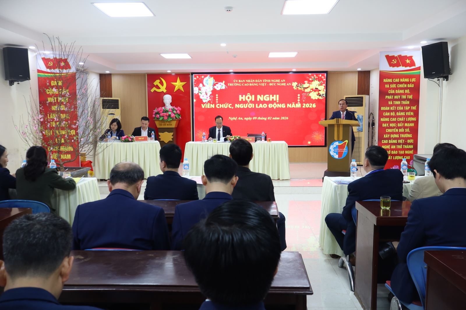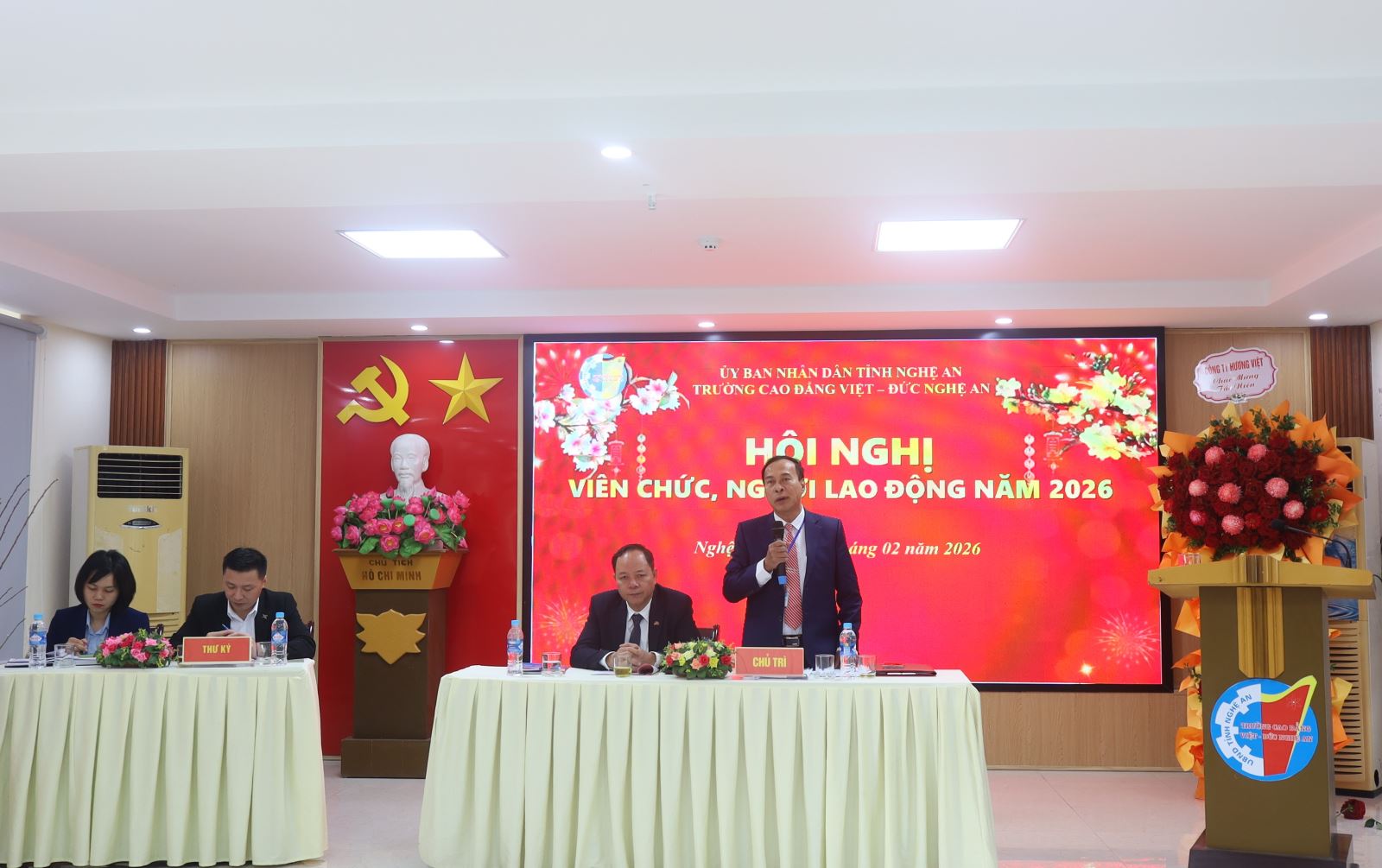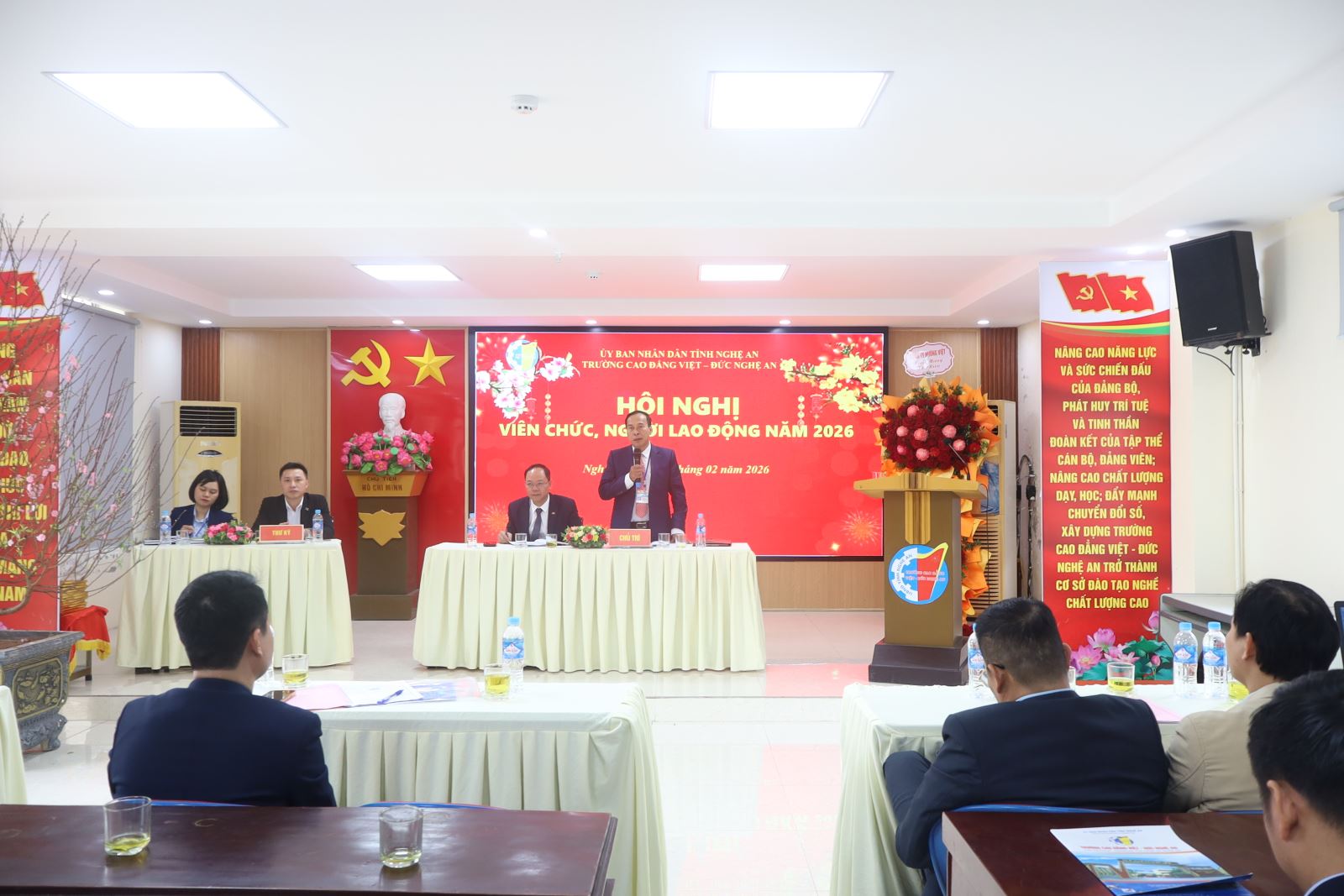Sáng ngày 09/02/2026, Trường Cao đẳng Việt – Đức Nghệ An tổ chức Hội nghị cán bộ, viên chức, người lao động năm 2026. Về dự Hội nghị có đồng chí Mạnh Thị Thúy Nga – Phó Trưởng phòng Bảo vệ Chính trị nội bộ - Công an tỉnh Nghệ An; đồng chí Lê Xuân Trình – Chủ tịch Công đoàn phường Trường Vinh. Về phía Trường Cao đẳng Việt – Đức Nghệ An có các đồng chí trong Đảng ủy, Ban Giám hiệu và toàn thể cán bộ, viên chức, người lao động trong toàn trường. ThS. Nguyễn Hữu Hằng – Bí thư Đảng ủy, Hiệu trưởng; ThS. Cao Anh Tuấn – Phó Hiệu trưởng, Chủ tịch Công đoàn trường đồng chủ trì Hội nghị.