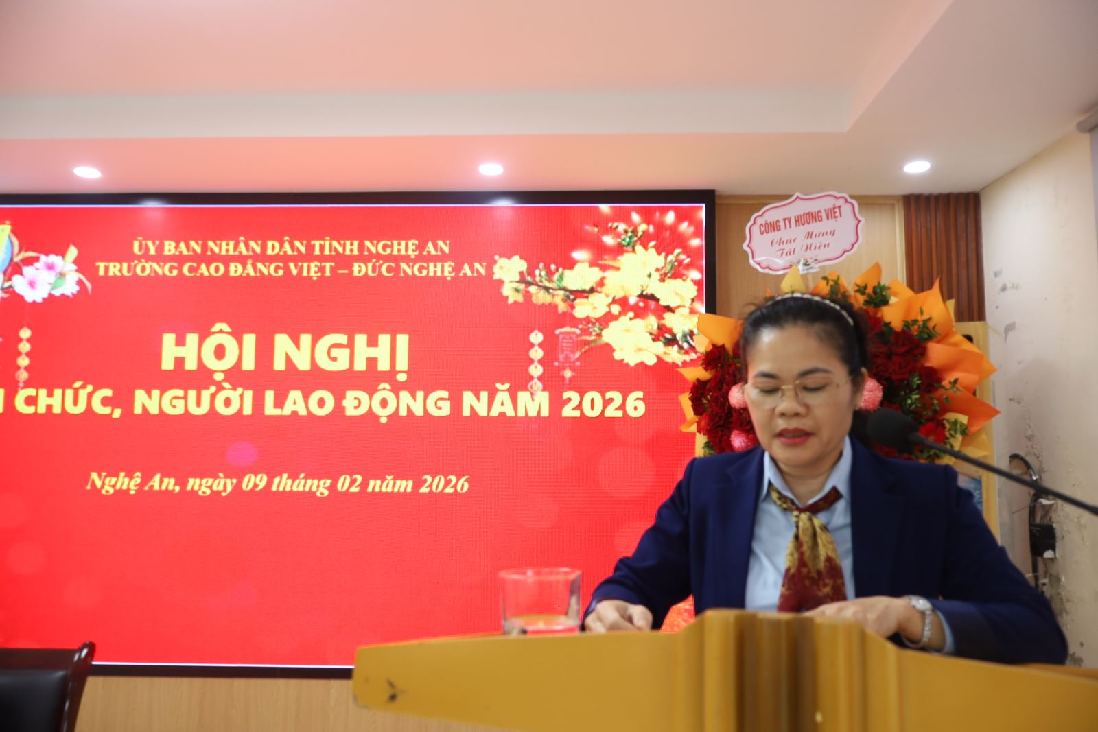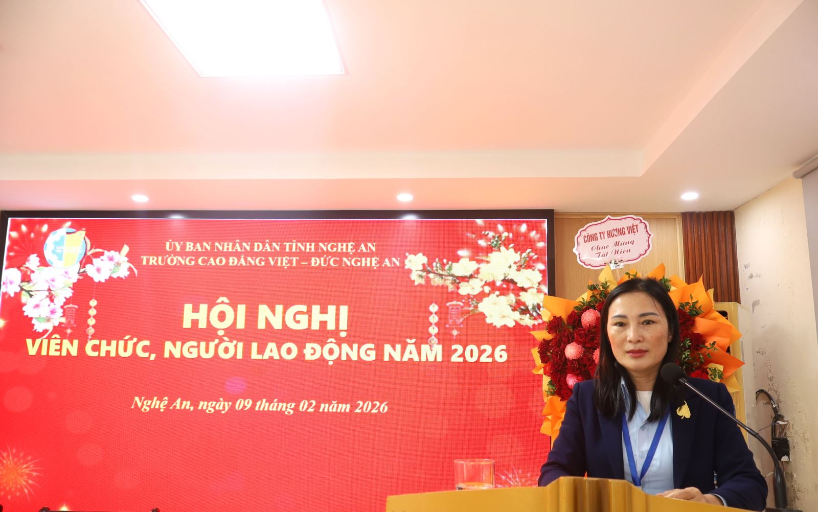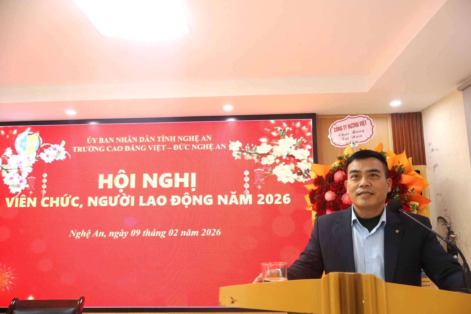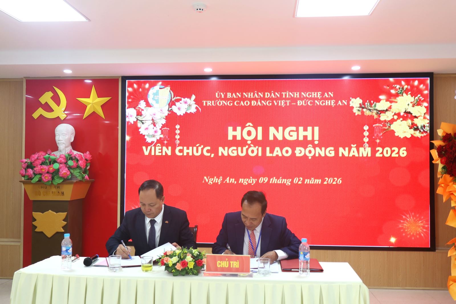 Sáng ngày 09/02/2026, Trường Cao đẳng Việt – Đức Nghệ An tổ chức Hội nghị cán bộ, viên chức, người lao động năm 2026. Về dự Hội nghị có đồng chí Mạnh Thị Thúy Nga – Phó Trưởng phòng Bảo vệ Chính trị nội bộ - Công an tỉnh Nghệ An; đồng chí Lê Xuân Trình – Chủ tịch Công đoàn phường Trường Vinh. Về phía Trường Cao đẳng Việt – Đức Nghệ An có các đồng chí trong Đảng ủy, Ban Giám hiệu và toàn thể cán bộ, viên chức, người lao động trong toàn trường. ThS. Nguyễn Hữu Hằng – Bí thư Đảng ủy, Hiệu trưởng; ThS. Cao Anh Tuấn – Phó Hiệu trưởng, Chủ tịch Công đoàn trường đồng chủ trì Hội nghị.