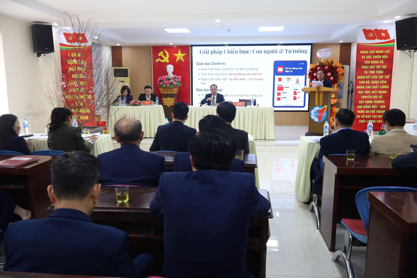 Mở đầu Hội nghị, ThS. Nguyễn Hữu Hằng – Bí thư Đảng ủy, Hiệu trưởng đã trình bày báo cáo tình hình thực hiện Nghị quyết Hội nghị cán bộ, viên chức năm 2025 và phương hướng nhiệm vụ năm 2026. Năm 2025, dù đối mặt với nhiều khó khăn nhưng các phong trào thi đua luôn được cán bộ, viên chức, người lao động Trường Cao đẳng Việt – Đức Nghệ An triển khai thực hiện hiệu quả, tạo chuyển biến rõ nét, góp phần thúc đẩy các hoạt động của Nhà trường, hoàn thành xuất sắc nhiệm vụ. Cán bộ, viên chức Nhà trường luôn phấn đấu xây dựng tập thể ngày càng vững mạnh, đội ngũ cán bộ quản lý chuyên nghiệp, đội ngũ giảng viên tâm huyết, có trình độ chuyên môn cao, tiếp tục nâng cao chất lượng đào tạo, quản lý đào tạo theo tiêu chí cơ sở Giáo dục nghề nghiệp chất lượng cao, ứng dụng các đề tài khoa học, sáng kiến kinh nghiệm vào các hoạt động thực tiễn của Nhà trường.