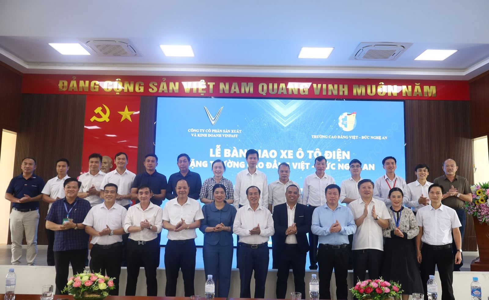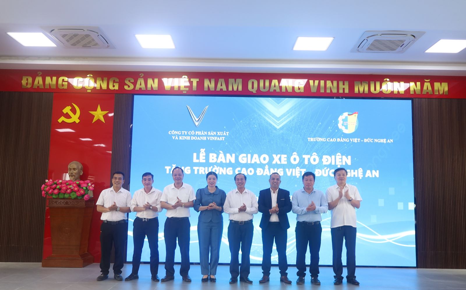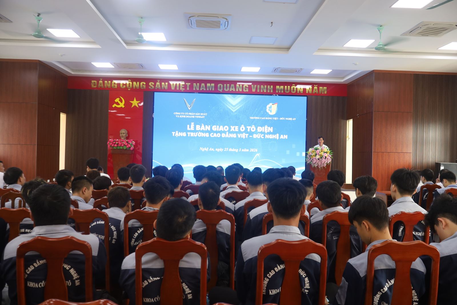 Điểm nhấn của chương trình là Lễ Bàn giao xe Ô tô điện do VinFast trao tặng Trường Cao đẳng Việt – Đức Nghệ An. Đây là thiết bị đào tạo có ý nghĩa quan trọng, góp phần giúp giảng viên và học sinh, sinh viên có điều kiện tiếp cận trực tiếp với công nghệ xe điện tiên tiến, phục vụ hiệu quả cho công tác giảng dạy, học tập và nghiên cứu.