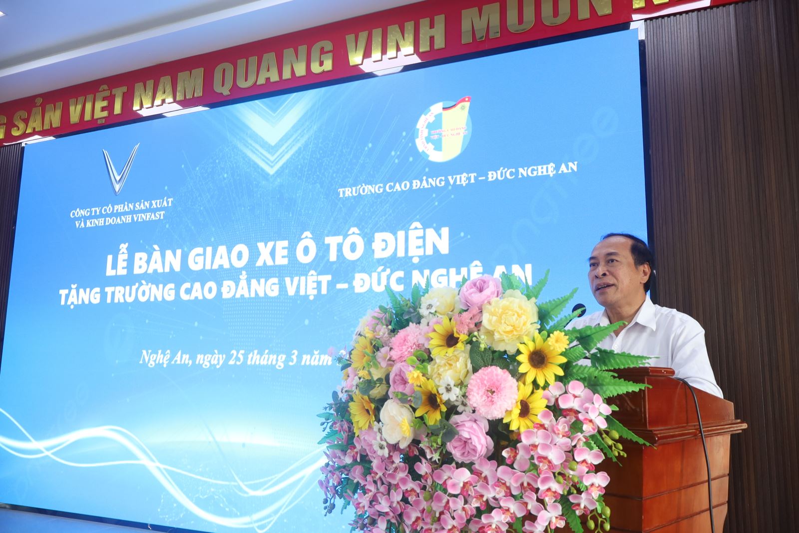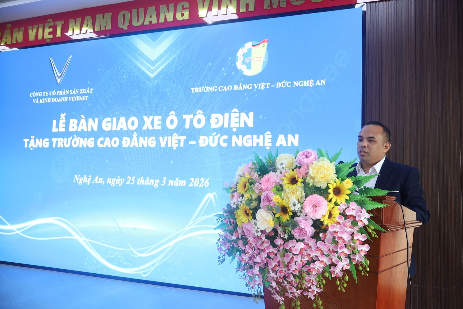 Phát biểu tại buổi Lễ, ông Đặng Đình Mạnh – Quản lý chất lượng Dịch vụ hậu mãi Vinfast khẳng định, doanh nghiệp luôn chú trọng đầu tư phát triển nguồn nhân lực chất lượng cao, đồng thời cam kết đồng hành cùng Trường Cao đẳng Việt – Đức Nghệ An trong việc đào tạo đội ngũ kỹ thuật viên đáp ứng yêu cầu phát triển của ngành Công nghiệp Ô tô điện tại Việt Nam và trên thế giới.