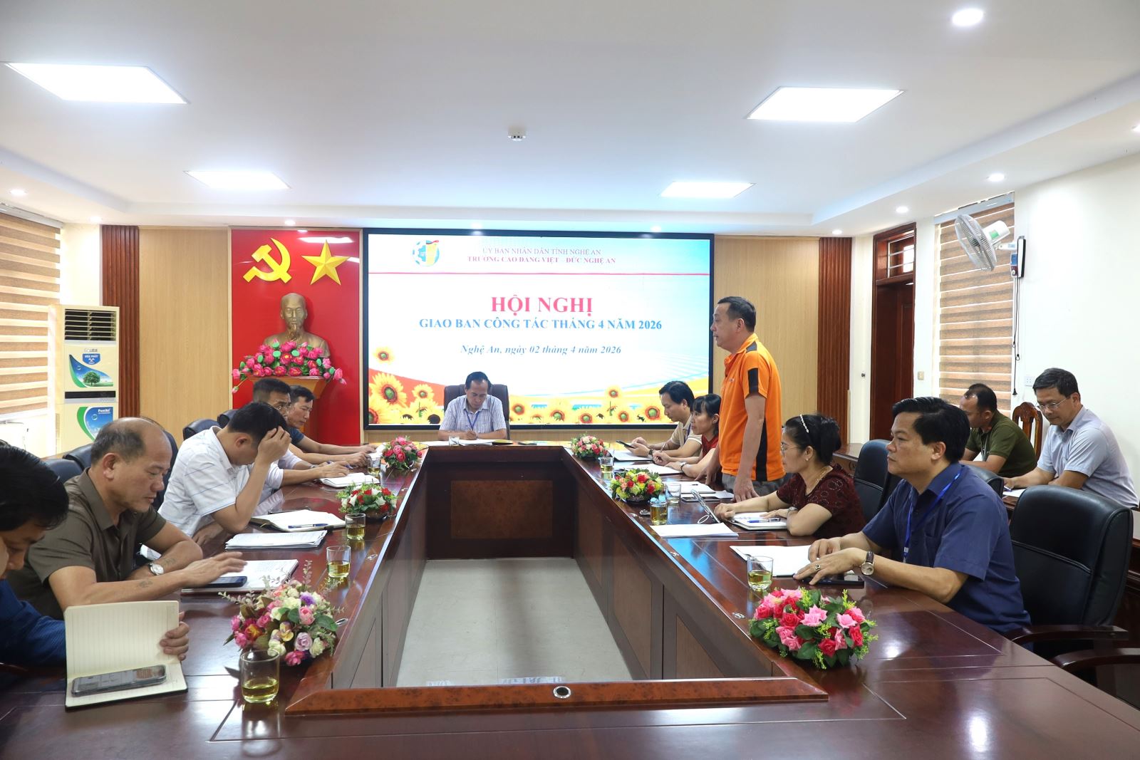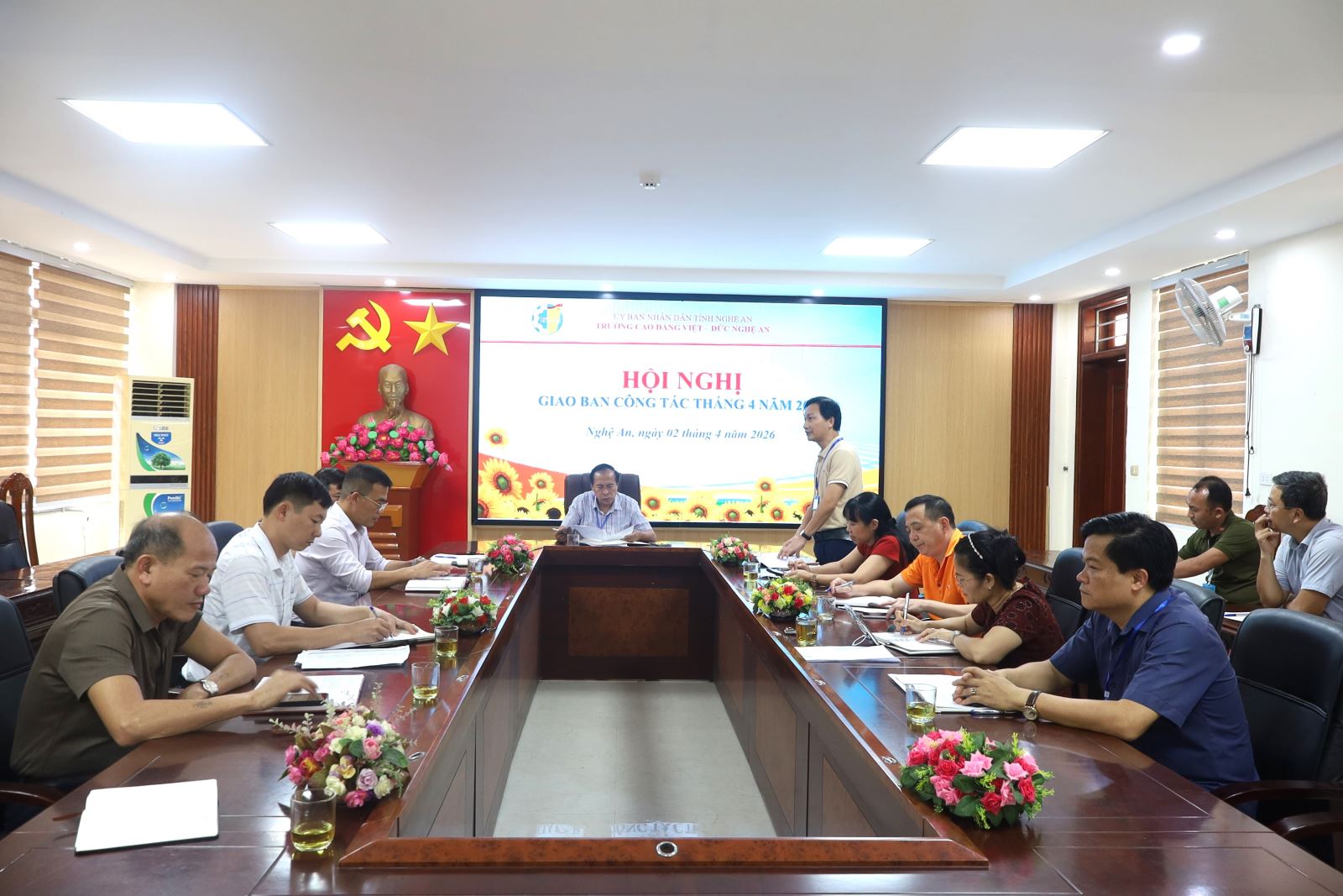 Hội nghị Giao ban công tác tháng 4 năm 2026 của Trường Cao đẳng Việt – Đức Nghệ An diễn ra trong không khí nghiêm túc, dân chủ và xây dựng. Phát biểu kết luận Hội nghị, ThS. Nguyễn Hữu Hằng – Bí thư Đảng ủy, Hiệu trưởng đánh giá cao tinh thần trách nhiệm, nỗ lực của các đơn vị phòng, khoa; đồng thời, đồng chí Hiệu trưởng cũng đề nghị toàn trường tập trung thực hiện tốt các nhiệm vụ trọng tâm trong tháng 4, tiếp tục nêu cao tinh thần trách nhiệm, đoàn kết, khắc phục mọi khó khăn, phấn đấu hoàn thành xuất sắc các nhiệm vụ mục tiêu đề ra trong thời gian tới.