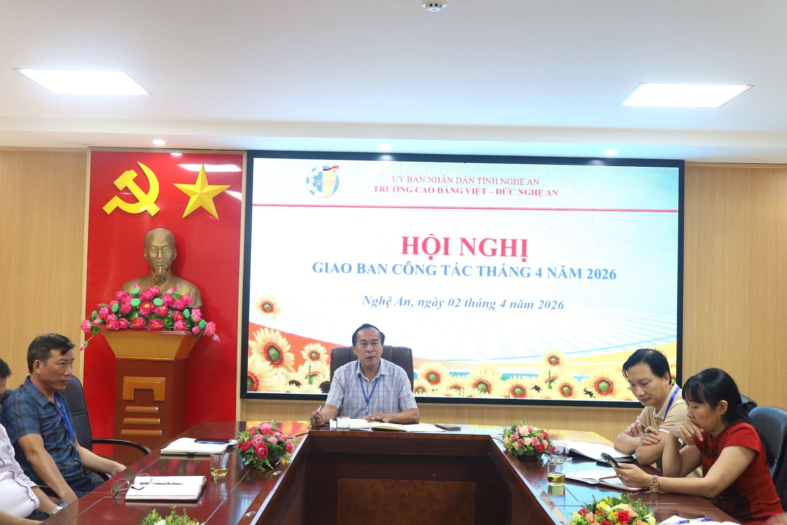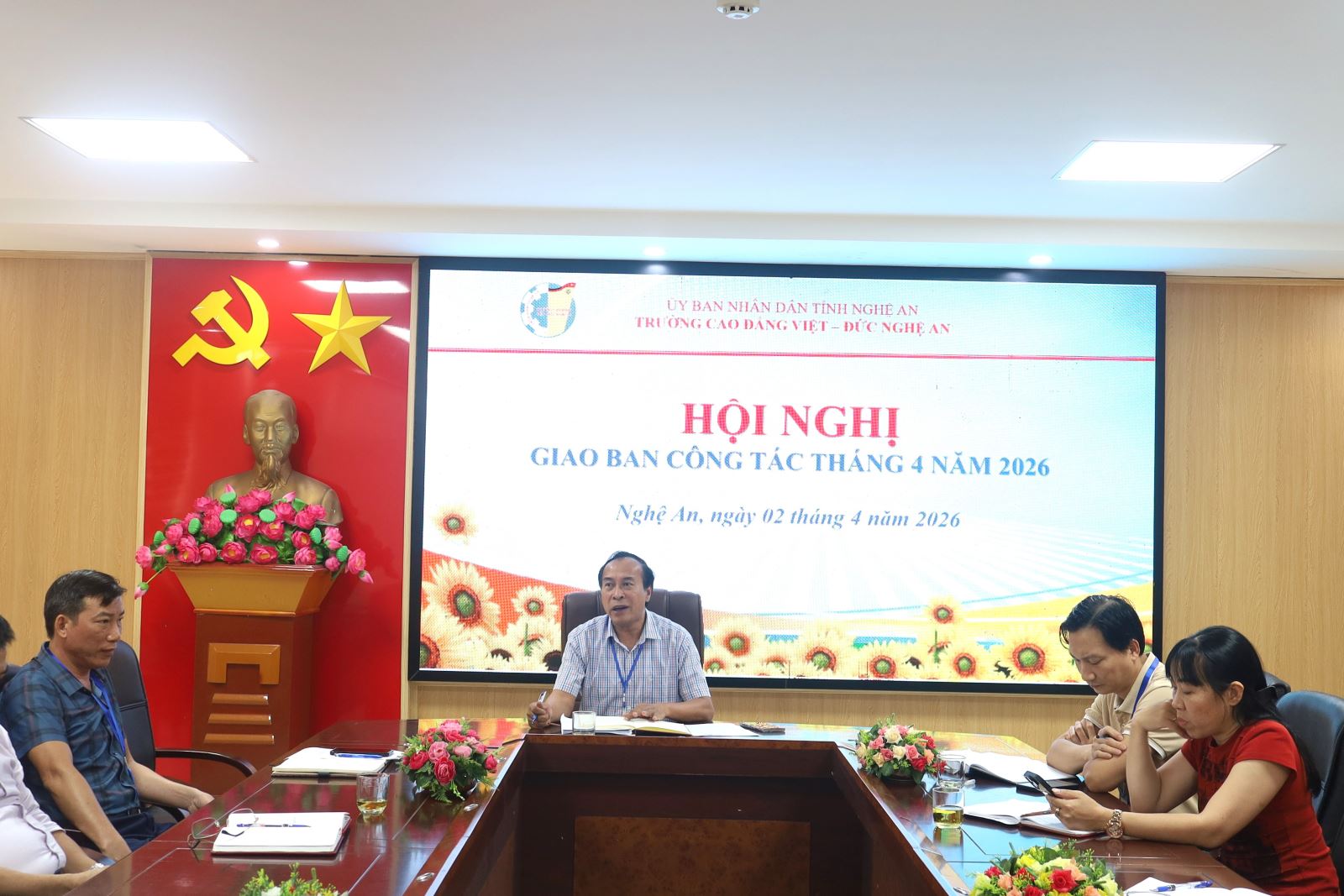 Chiều ngày 02/4/2026, Trường Cao đẳng Việt – Đức Nghệ An tổ chức Hội nghị Giao ban công tác tháng 4 nhằm đánh giá kết quả thực hiện nhiệm vụ tháng 3 và triển khai kế hoạch trọng tâm trong tháng 4 năm 2026. Tham dự Hội nghị có các đồng chí trong Đảng ủy; Ban Giám hiệu; trưởng, phó các đơn vị phòng, khoa, đoàn thể. ThS. Nguyễn Hữu Hằng – Bí thư Đảng ủy, Hiệu trưởng chủ trì Hội nghị.