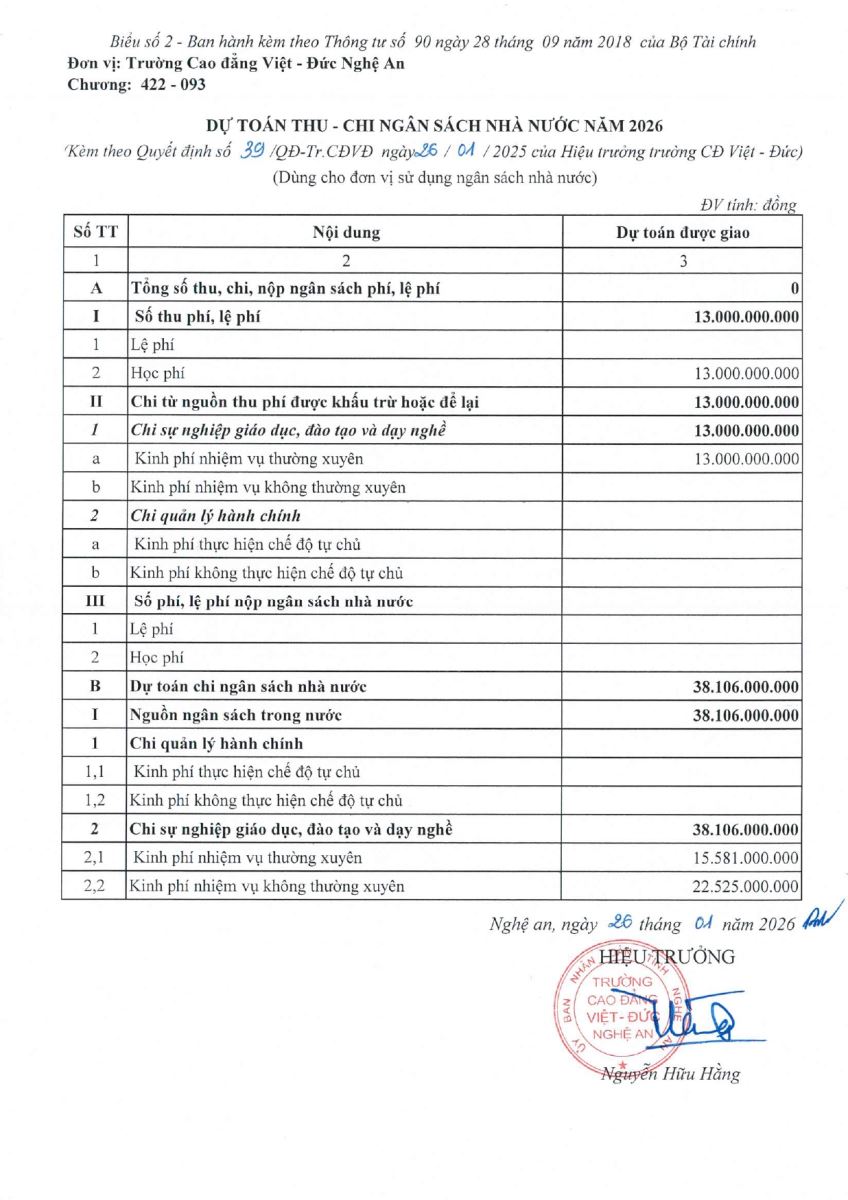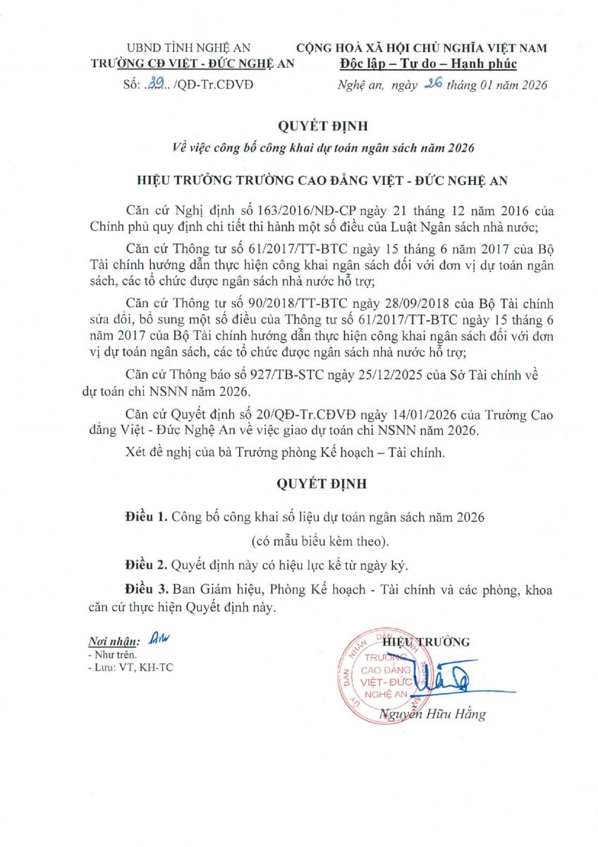Quyết định số 39/QĐ-Tr.CĐVĐ của Trường Cao đẳng Việt - Đức Nghệ An về việc Công bố công khai Dự toán ngân sách năm 2026