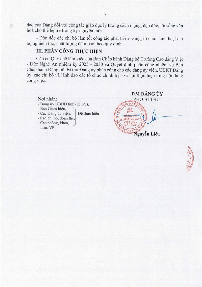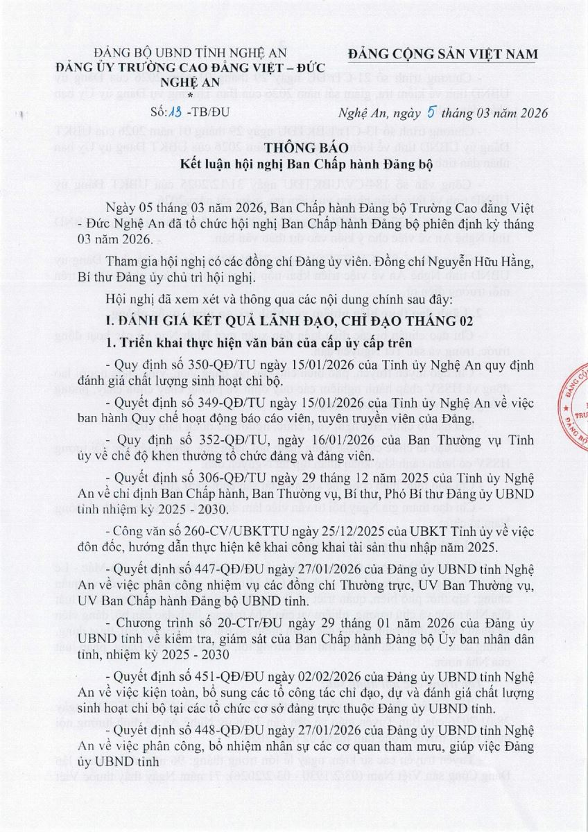 Thông báo số 13-TB/ĐU của Đảng ủy Trường Cao đẳng Việt - Đức Nghệ An Kết luận Hội nghị Ban Chấp hành Đảng bộ phiên định kỳ tháng 3 năm 2026