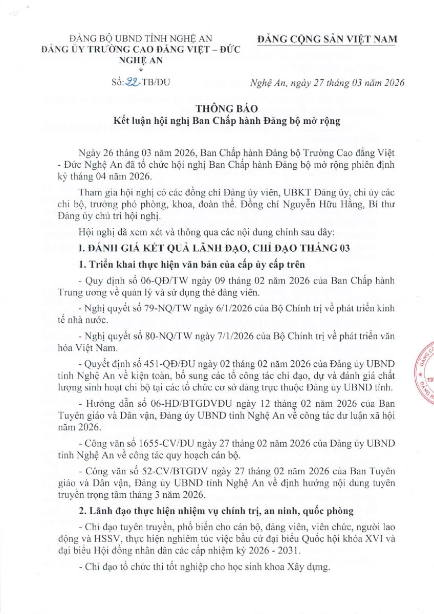 Thông báo số 22 - TB/ĐU của Đảng ủy Trường Cao đẳng Việt - Đức Nghệ An về Kết luận Hội nghị Ban Chấp hành Đảng bộ mở rộng